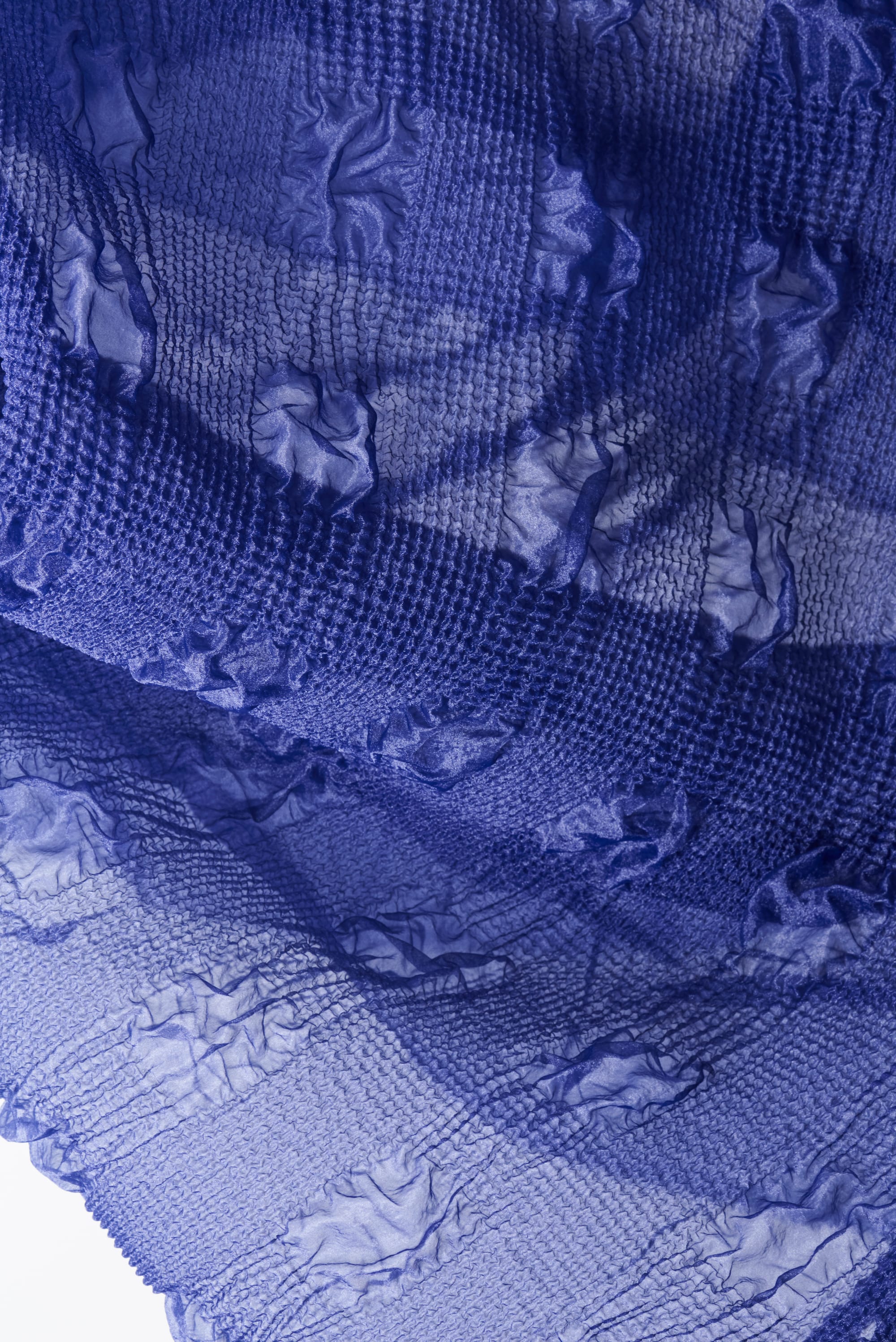 Sudō has even made use of industry by-products like kuwako and koishimaru silkworm cocoons through her kibiso crisscross technique, which makes even this hard, thick material workable for production. She finds another unlikely use for nature in her workshops, which utilize a special bacteria to purify their wastewater for reuse on-site. In the future, Sudō’s eco-oriented vision looks beyond water-soluble fibers to fibers that themselves are made out of water. She predicts that these “could be used to make clothes and architectural spaces, then dissolved back to water when no longer needed.”
