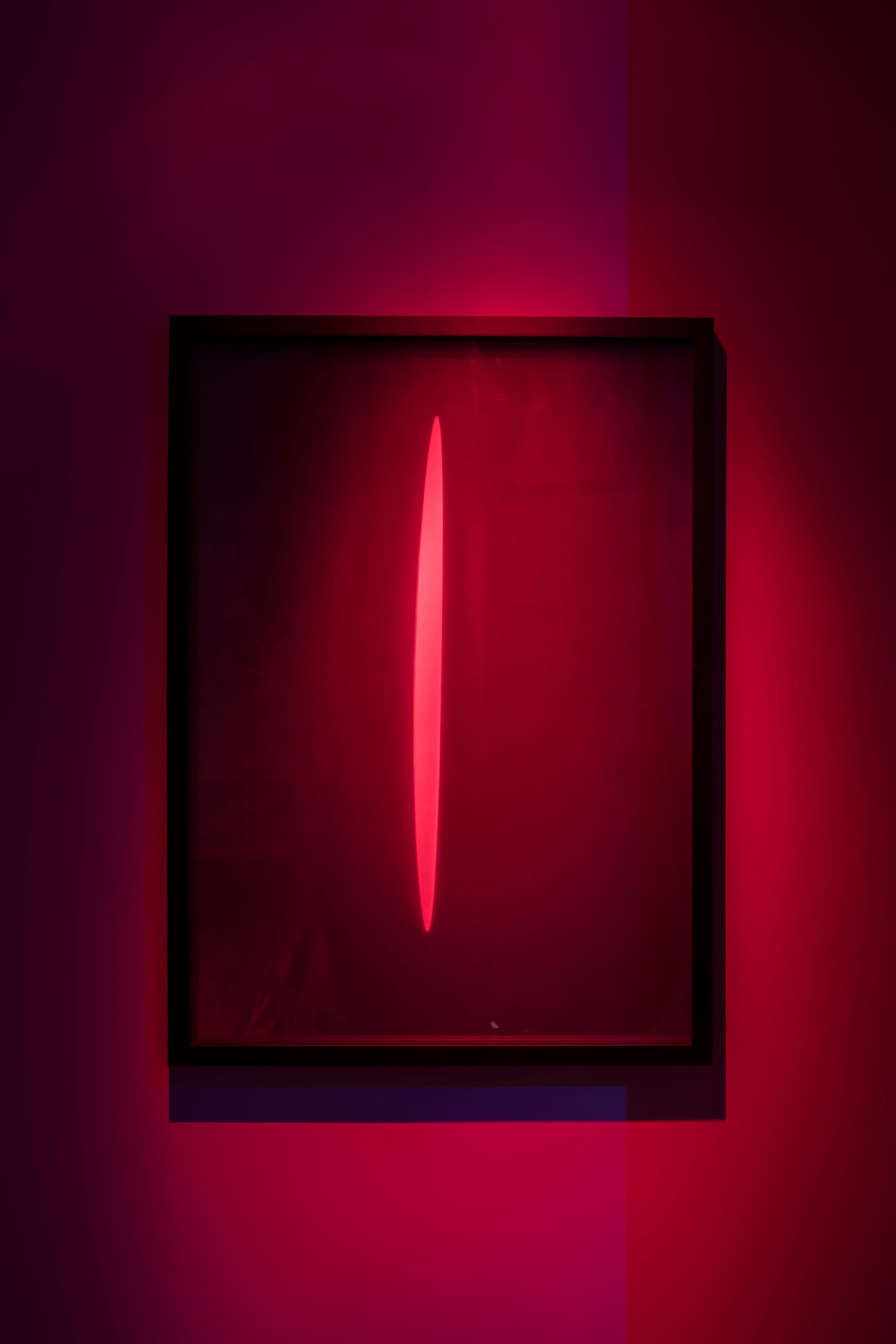 The exhibition encourages durational looking, with seating provided next to or inside five installations. For “Hind Sight” (1984), the viewer proceeds through a corridor into a dark chamber devoid of visual or aural stimuli (apart from the exhalations of an air duct). The experience is similar to falling asleep, as physical reality recedes from consciousness and the viewer enters a meditative state. After 10 to 15 minutes, the viewer’s pupils are fully dilated, at which point the viewer is called back to the material world by the presence of a dim light on the opposite side of the chamber, so faint that it can only be perceived in the viewer’s peripheral vision.