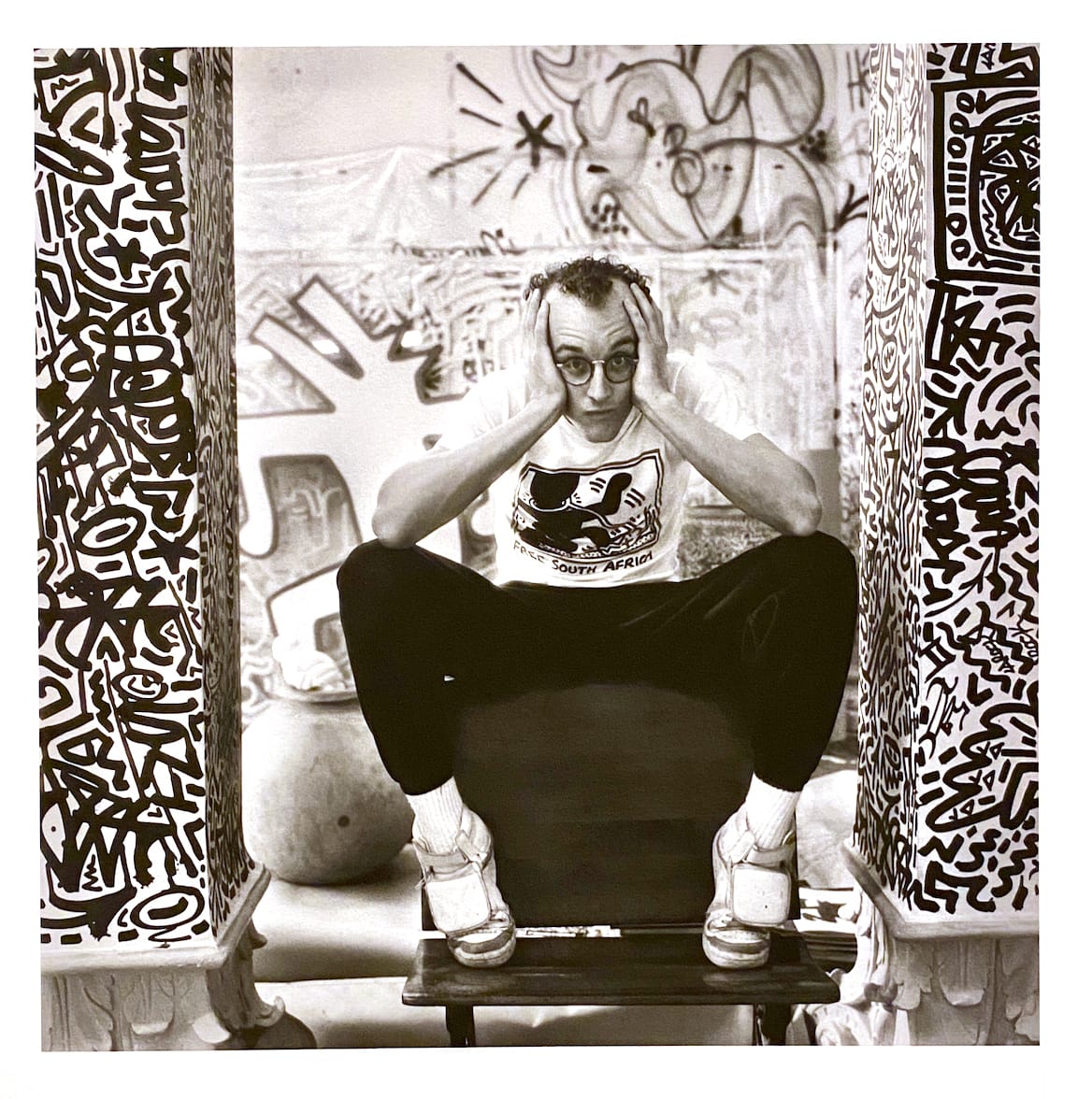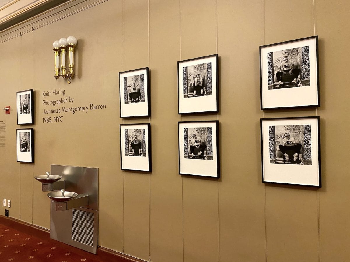 Outside Shuman Lounge, a series of black-and-white portraits of Haring by Jeannette Montgomery Barron complement the mural's presentation. Barron photographed the artist in his Lower Broadway studio in spring 1985. She captures Haring immersed in his own artwork, surrounded by his distinctive designs and wearing a t-shirt printed with the message "Free South Africa," based on a painting supporting the anti-apartheid movement. His expressive personality is also on display.