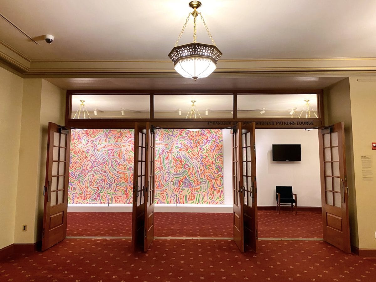 Such is the case for "Fiorucci Walls," a massive panel painted by Haring and artistLA II (Angel Ortiz) in 1983, now unexpectedly on view at the New York City Center in Midtown Manhattan -- the first time it's ever been seen in NYC. On loan from the MACo Museum of Chang Maiforthe theater's 2021-2022 season, the mural has been installed in the Shuman Lounge near the entrance, where audiences can admire it before a show or during intermission.