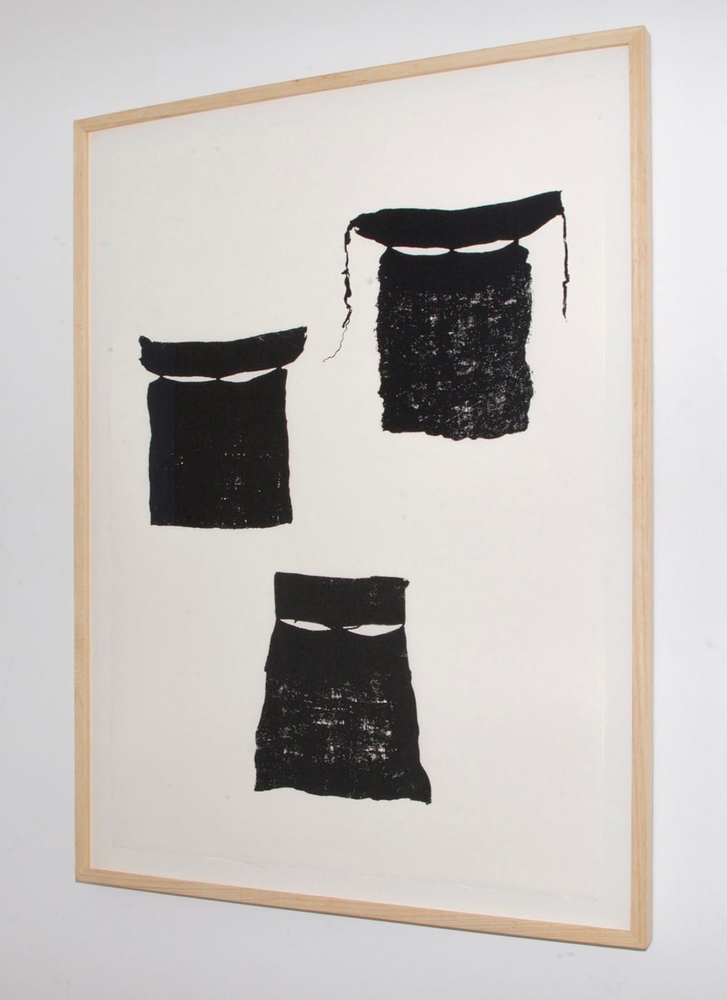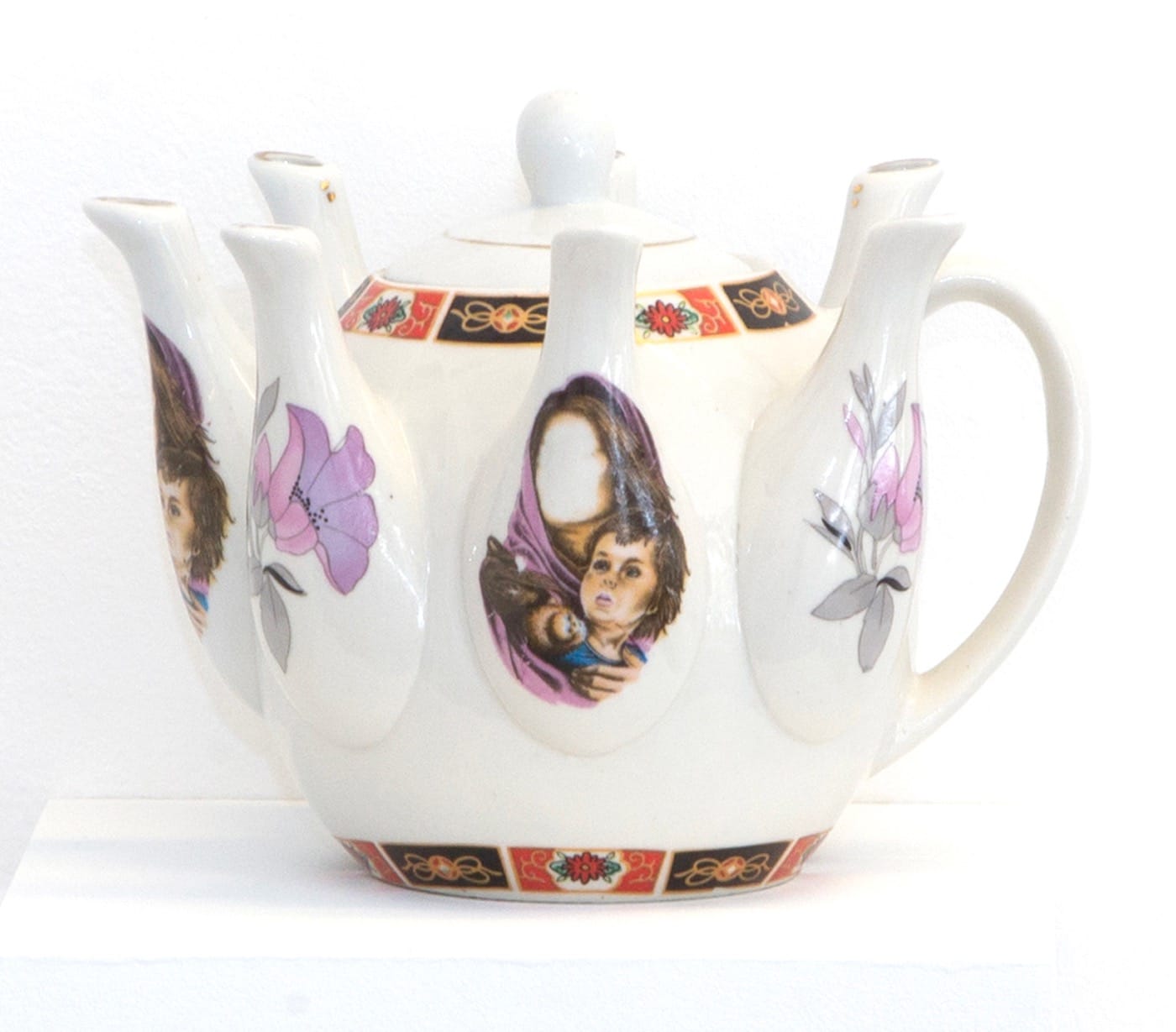 Her show assembles disparate things and images, yet hangs together beautifully: unified in predominantly post-conceptual palette of black, white and gray. This unity of tone allows the artist to mix boldly ancient artifacts and new things, illustrating the ongoing mêlée within the social fabric of Kuwait. One of the best examples of this fracas is the hydra-spouted “Porcelain Teapot” (2017) painted with flowers and images of a mother and her child, with the mother’s face excluded. This exclusion alludes to the history of Persian miniature painting, where in order to sidestep the prohibition against actually depicting Mohammed, artists in Muslim societies sometimes showed him with his face blank. This way, it could be claimed that they never actually drew Mohammed — only his clothes. In that history we also find faceless Mohammeds who originally had faces which were later scratched out. This restriction on showing face was the preference of one of Farid’s female relatives, whose face has been removed on her request from “Untitled” (2017), a family photograph placed next to “Porcelain Teapot” that depicts Farid’s father having his hair shorn. Another semiotically rich work is the limestone sculpture “Lovely Gift from Blessed Land” (2017) that looks like a gas can, but is in fact a replica of a portable container of holy water. Also there are multiple versions of the silkscreen “3 Burqas” (2017) that haunts and amuses. The menacing but madcap imagery of free floating burqas struck something deep in me that may have to do with my juvenile passion for Mad magazine and recent events around Je suis Charlie.