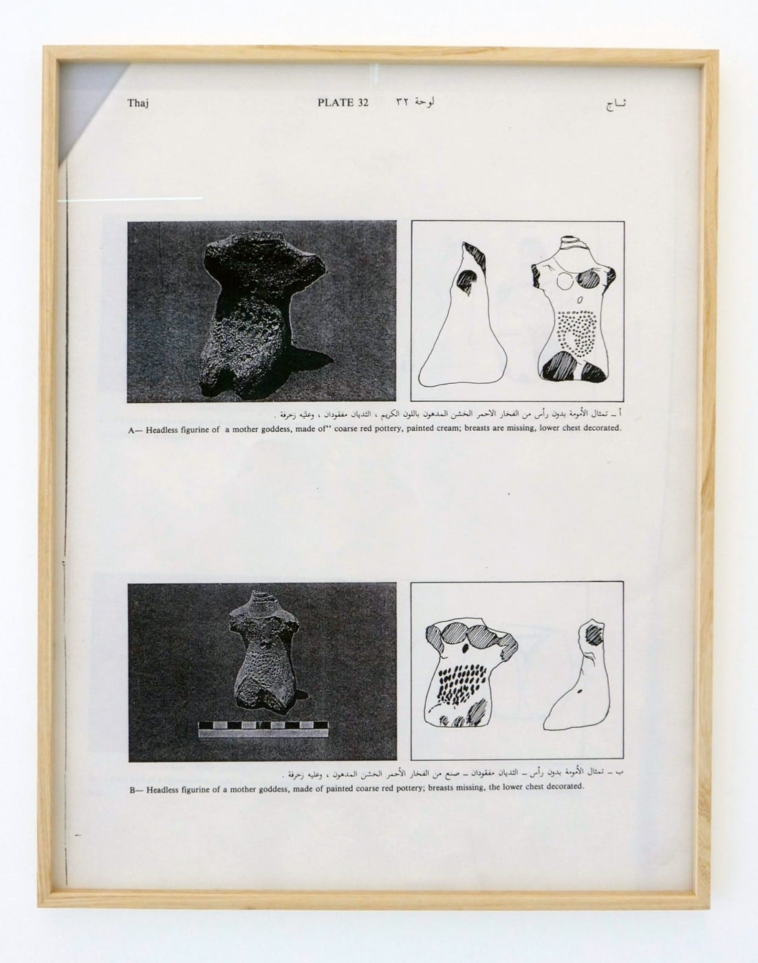 In this show she uses the graphic look of conceptual art to fashion an installation that explores a museum’s failure. The installation, taken as a whole, probes a selection of material and documentation found in storage of the never-completed Kuwait National Museum. Bombed and plundered during the Iraqi invasion of 1990, the deserted, unfinished museum lost many of its historic and contemporary artifacts: Mesopotamian sculptures, slippers, coins, earthen pitchers, and such. Farid’s show draws from the archival ruins and records of this kitty: for example, with the image of a clay mother goddess (an image-concept that is problematic within Islamic fundamentalism) called “Untitled” (2017). It is essentially a 1985 record of two Assyrian goddess artifacts with severed limbs and head unearthed at Failaka Island — made poignant in light of recent ISIS beheadings. Such images contain a black and white rod set alongside the unearthed matter that provides the reader with a sense of scale. This rod has been recreated by the artist and placed throughout the installation to good effect, recalling to mind the bâton that the insouciant French conceptual artist André Cadere ubiquitously utilized in the 1970s.