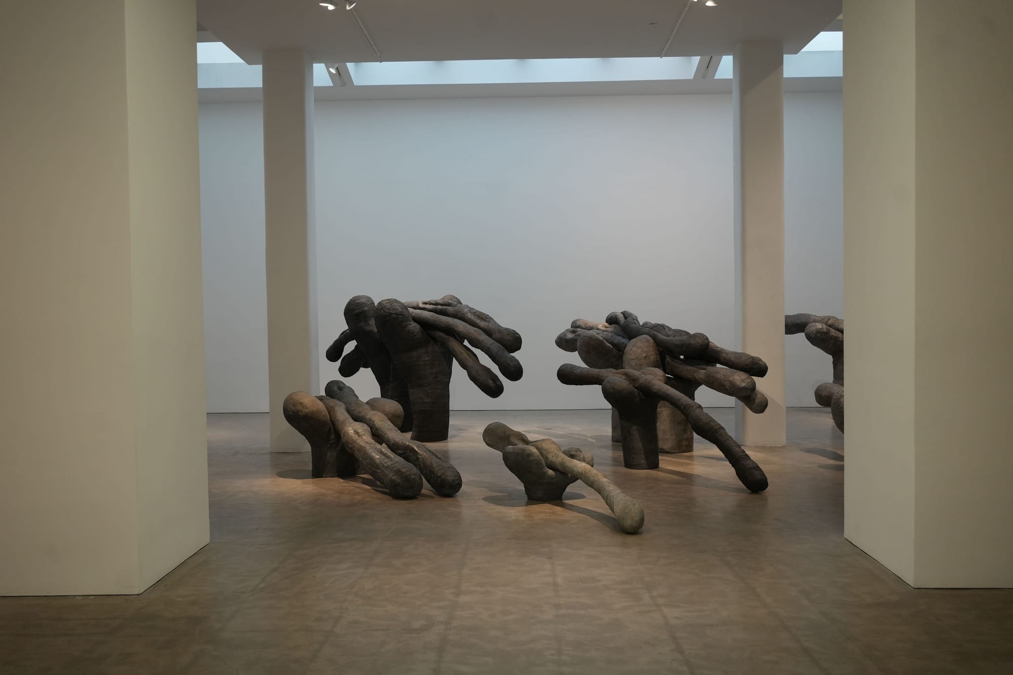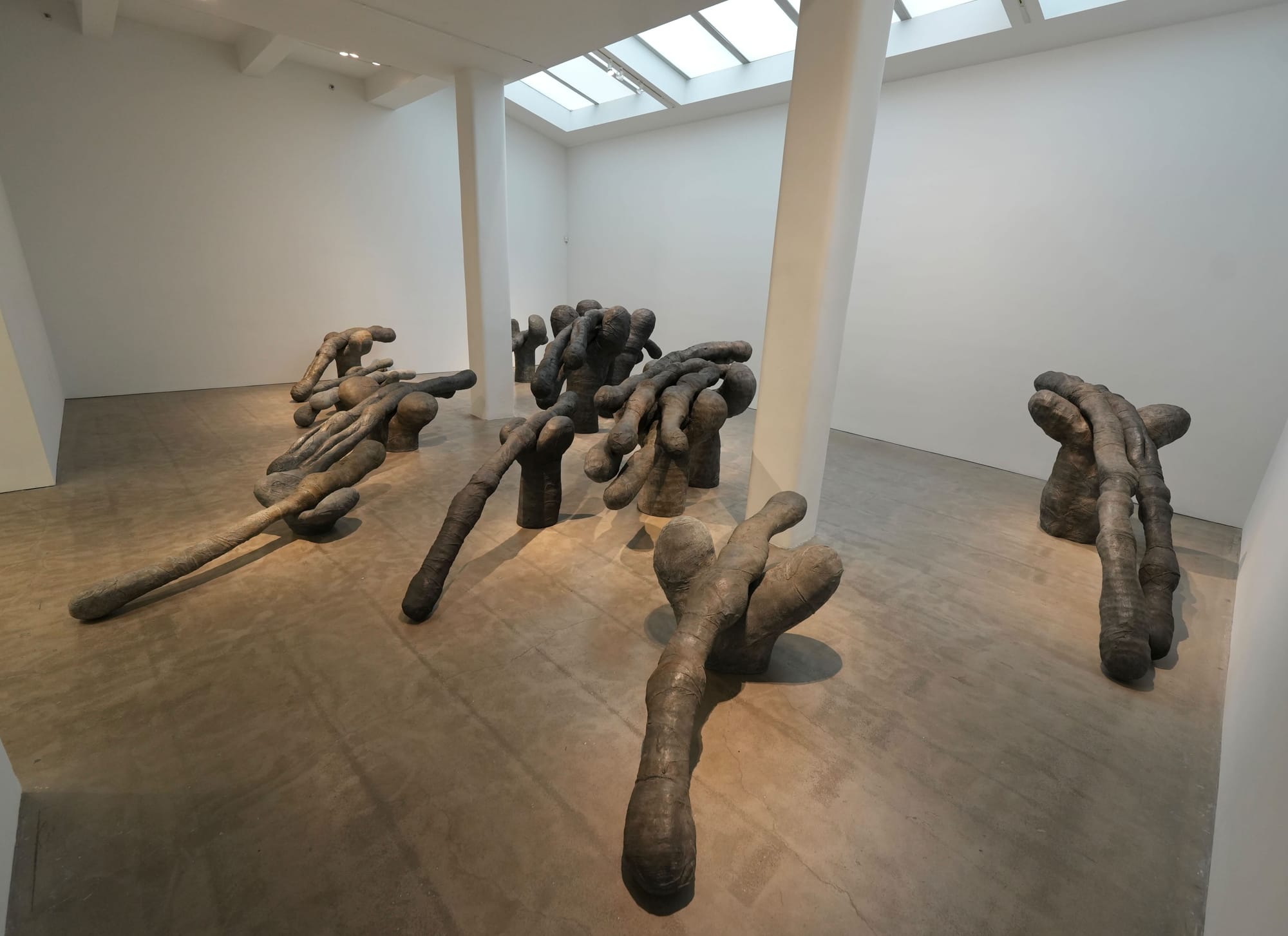 Widely considered the artist's magnum opus, an enormous sculpture titled “Across the Bering Strait” (1992–94) takes center stage at the eponymous exhibition. Created from graphite-washed Hydrocal cement hardened over steel and cloth armatures, the work's hulking, bulbous forms evoke evolution and migration over millennia. The structure resembles many things — fossilized dinosaur bones, fallen branches, mummified bodies, bandage-wrapped appendages, primitive tools, and bundled belongings — all evidence of organic passages across land and time.