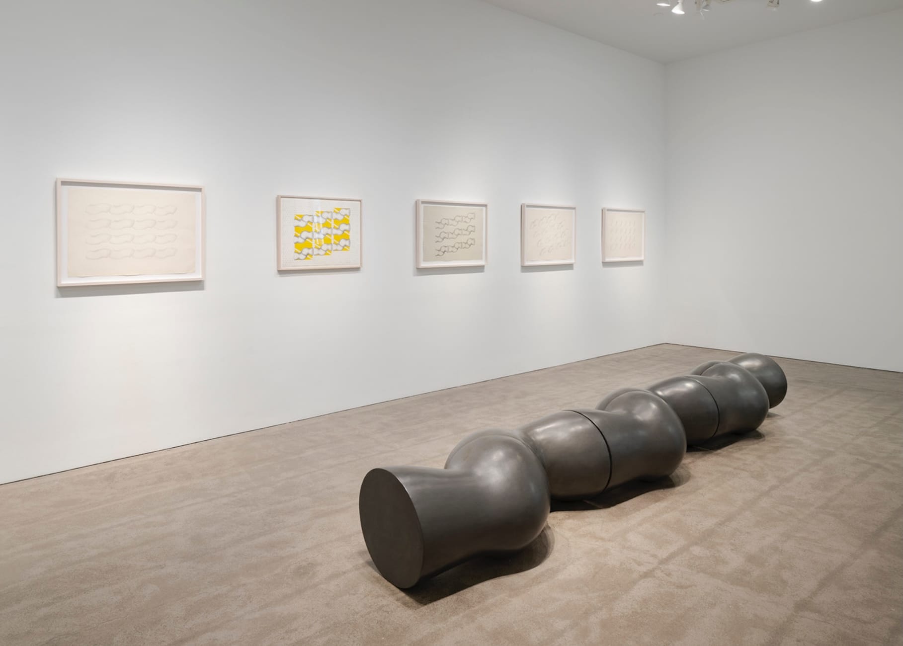 Additional works from Unger's archive are highlighted throughout the show, including colorful standalone sculptures that play with gravity, modularity, and biomorphism, as well as various graphite sketches of her repeated “Hexagonal Quintet” motif displayed alongside its realized fiberglass variation laid out on the gallery's floor.