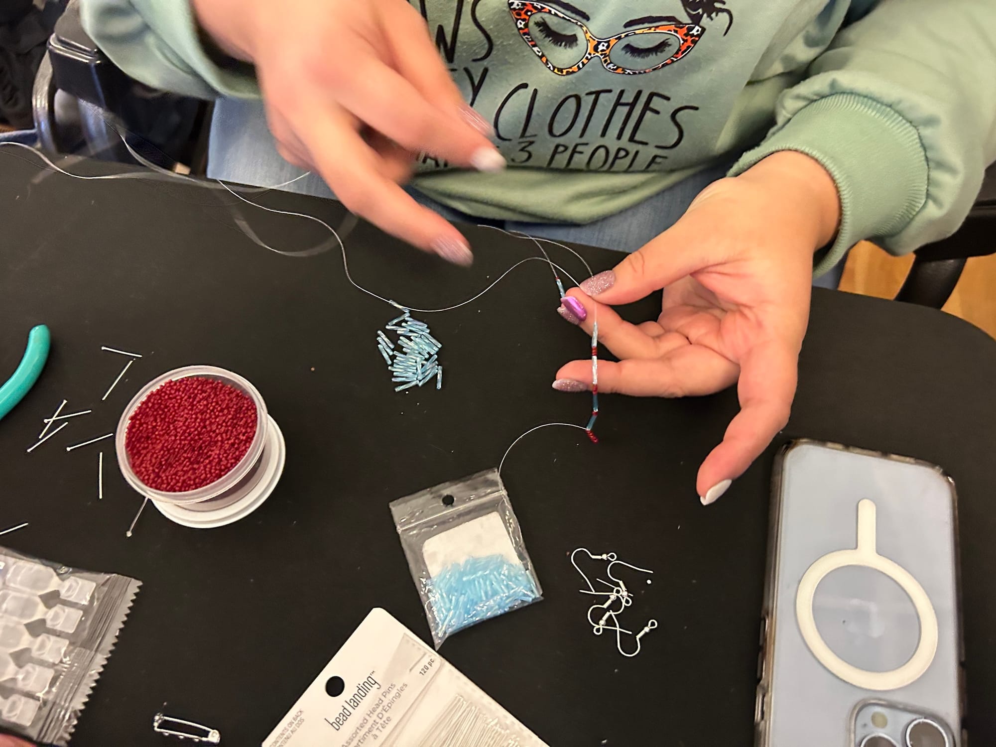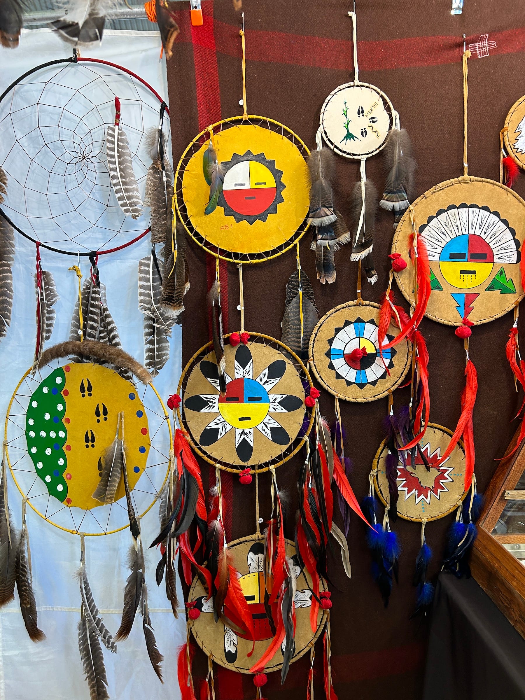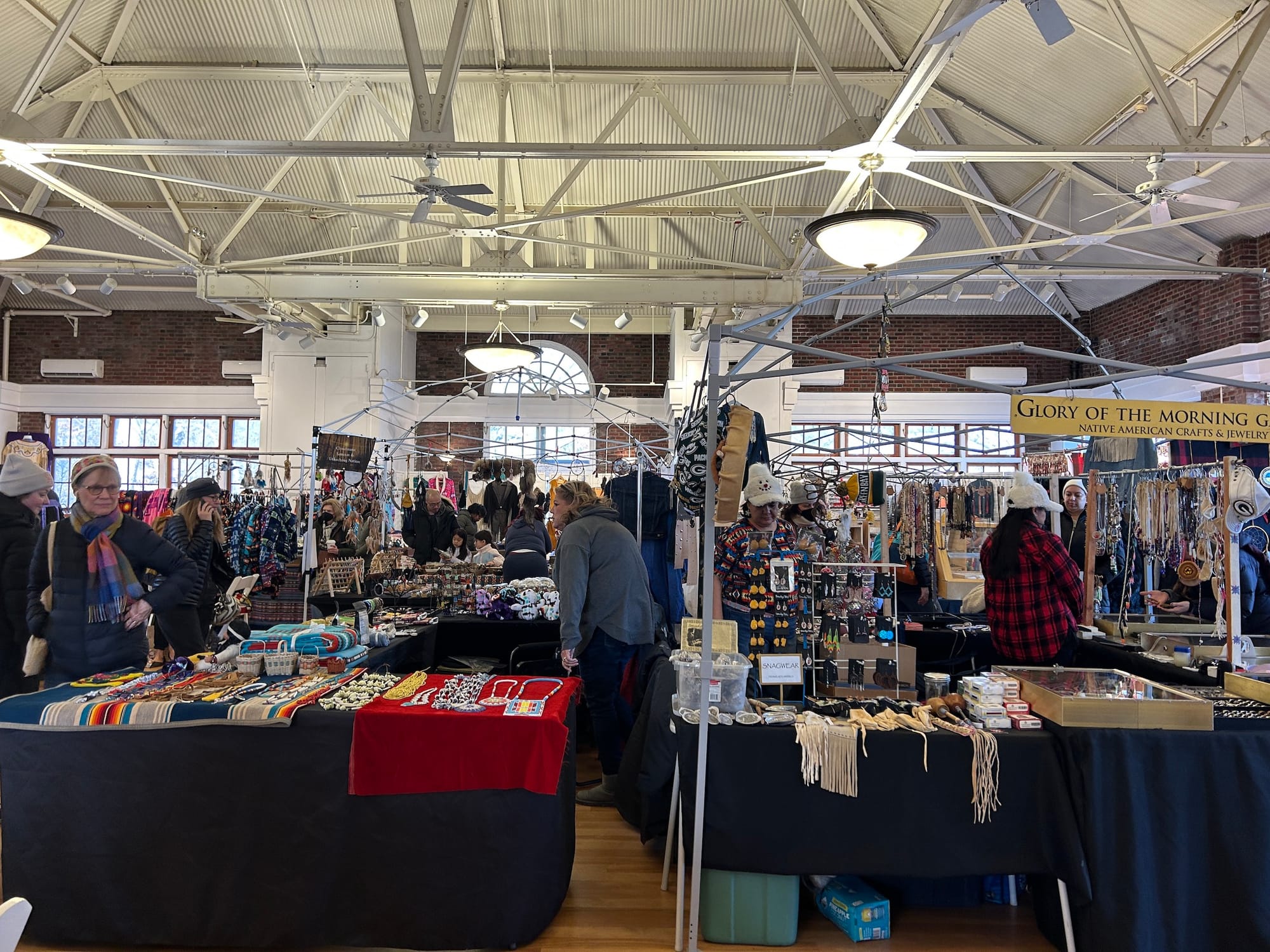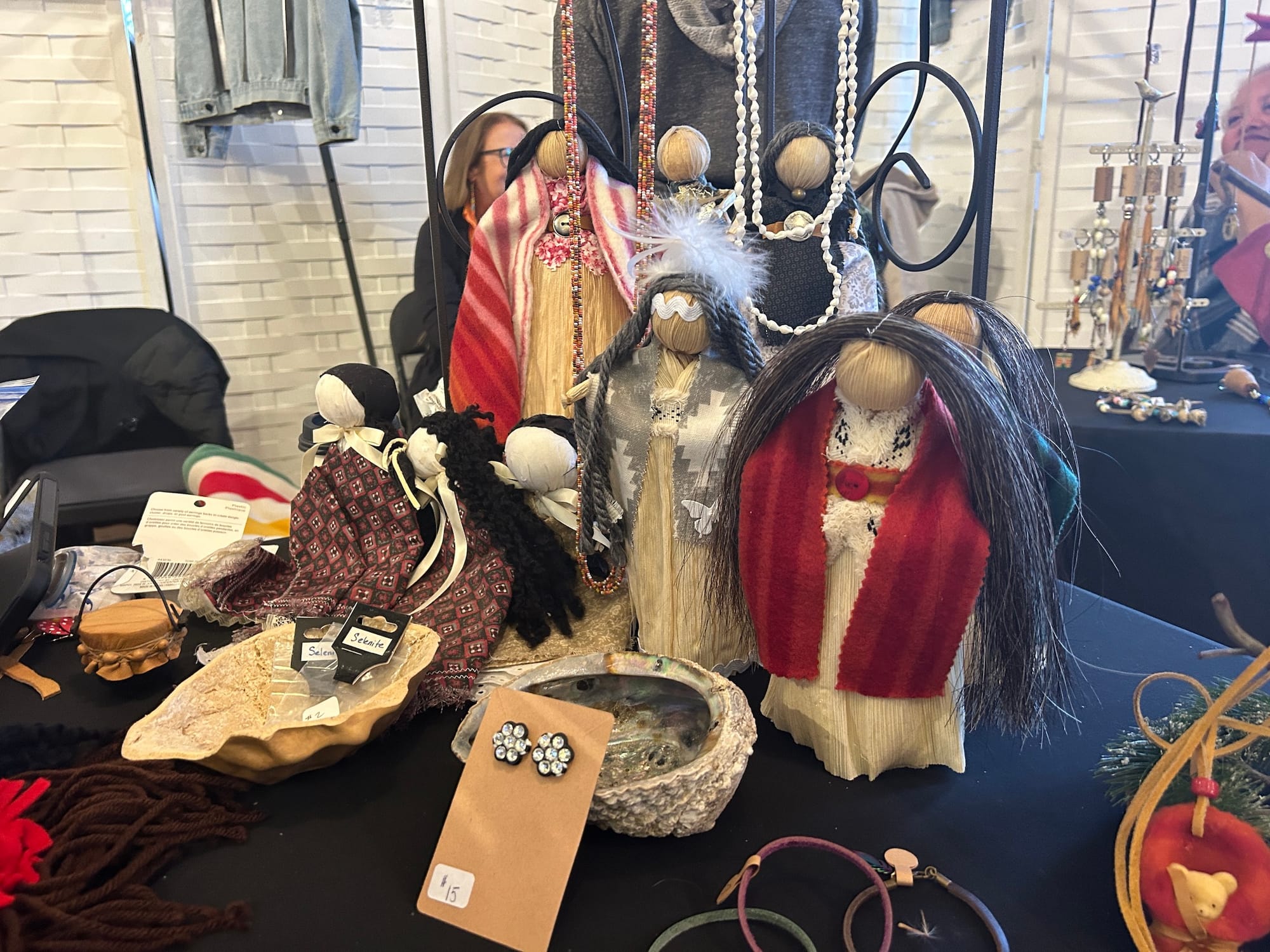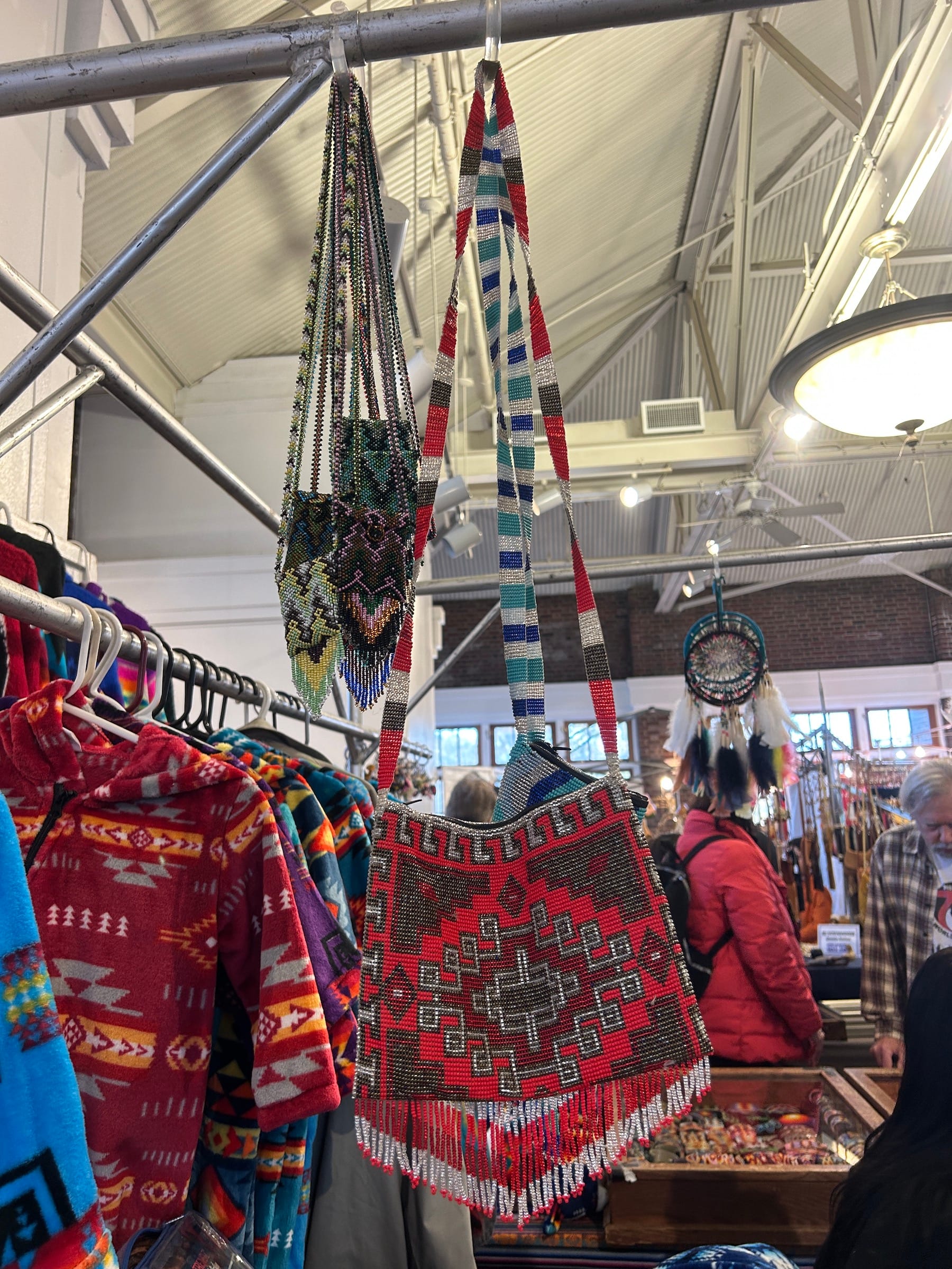 “We’ve known George Stonefish our whole lives, we’ve known Red Blanket, so it’s nice to get together because we see people that we know,” Rozlynn Tone-Pah-Hote, a Kiowa-Maya-Oneida contemporary beadworker, told Hyperallergic. She and her husband had brought handmade jewelry, lacrosse heads, and beaded holiday ornaments to the market, which she said had gone better for them in sales in comparison to this year’s Thunderbird American Indian Powwow in Queens.