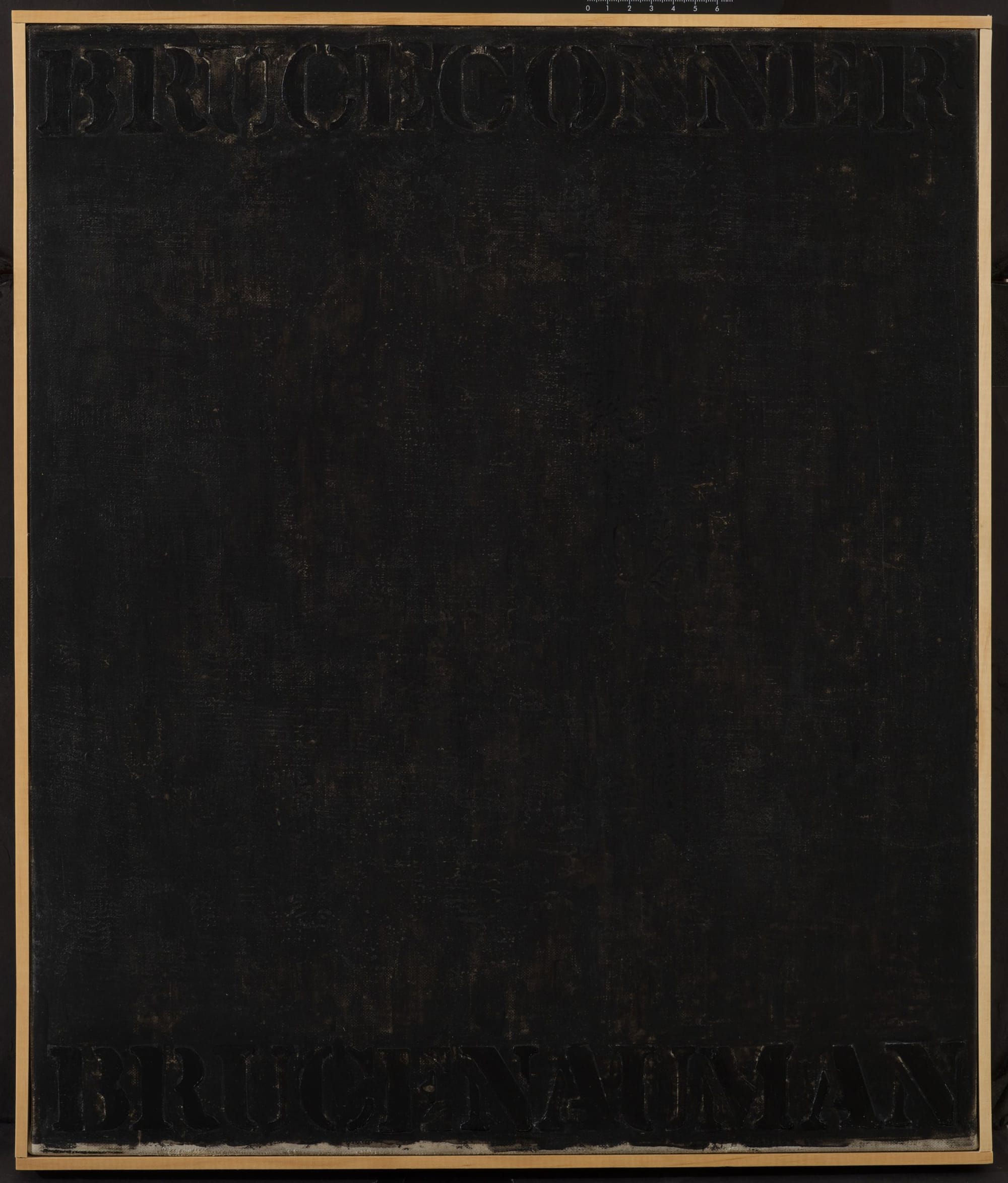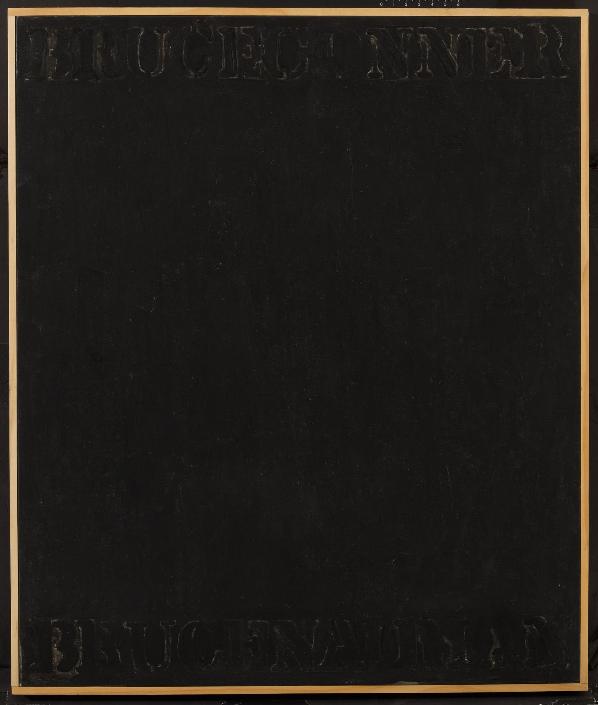 I began going through Johns’s Catalogue Raisonné looking for paintings that did not seem to fit in because of two works that I saw when I visited him a few months ago. They are nearly identical, with the primary difference being that one was done on fabric — a piece of bed sheet, I believe — and the other was done on canvas. Both paintings measure 20 1/7 by 17 inches and are done in acrylic and India ink. Along the top of the painting we read the name, BRUCE CONNER, while along the bottom we read, BRUCE NAUMAN. The letters and surface are covered in a black medium. The letters are raised and the canvas or fabric support is bare in areas around them. They were lying next to each on a table when I saw them. If I remember correctly, Johns did one and then, liking it, did another on canvas. There is nothing else like them in his oeuvre.