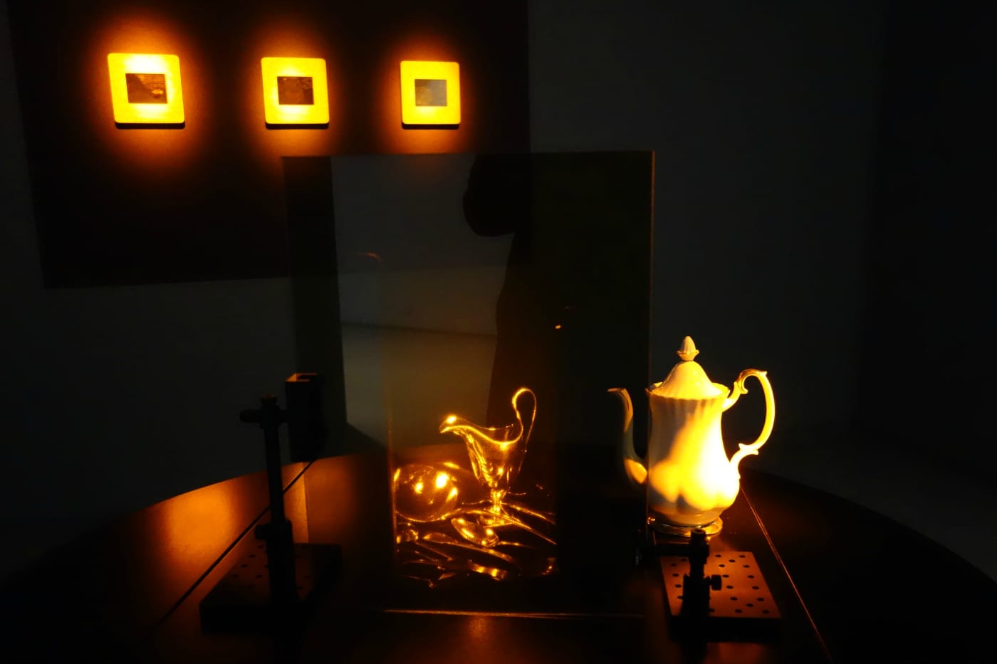 Wenyon & Gamble regularly use holography to ruminate on outdated technology. Their 2012 exhibition at Magnan Metz — A Universe held up for Inspection (reviewed in Hyperallergic by Ellen Pearlman) — explored the legacy of the analogue photograph. For instance, holograms of wooden glass plate storage boxes. It’s interesting that Wenyon & Gamble continue to emphasize that holography, in a way, has more in common with 19th-century photography than that of the 21st century. Daguerreotypes in Out of Place have a similar hands-on process to the holograms, which are animated with 3D images captured through lasers and emulsion on glass.