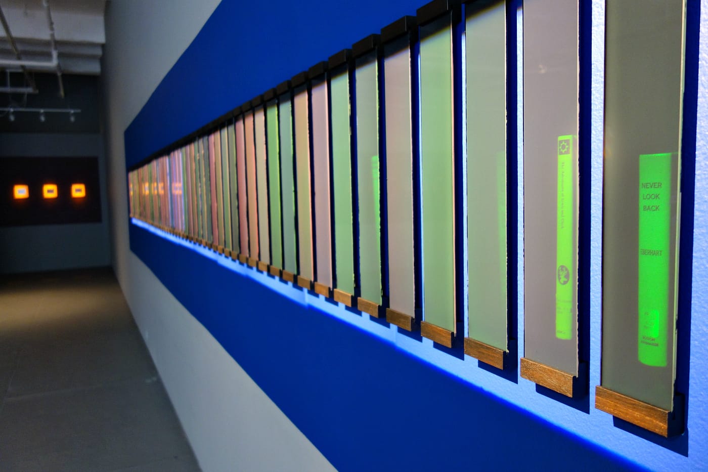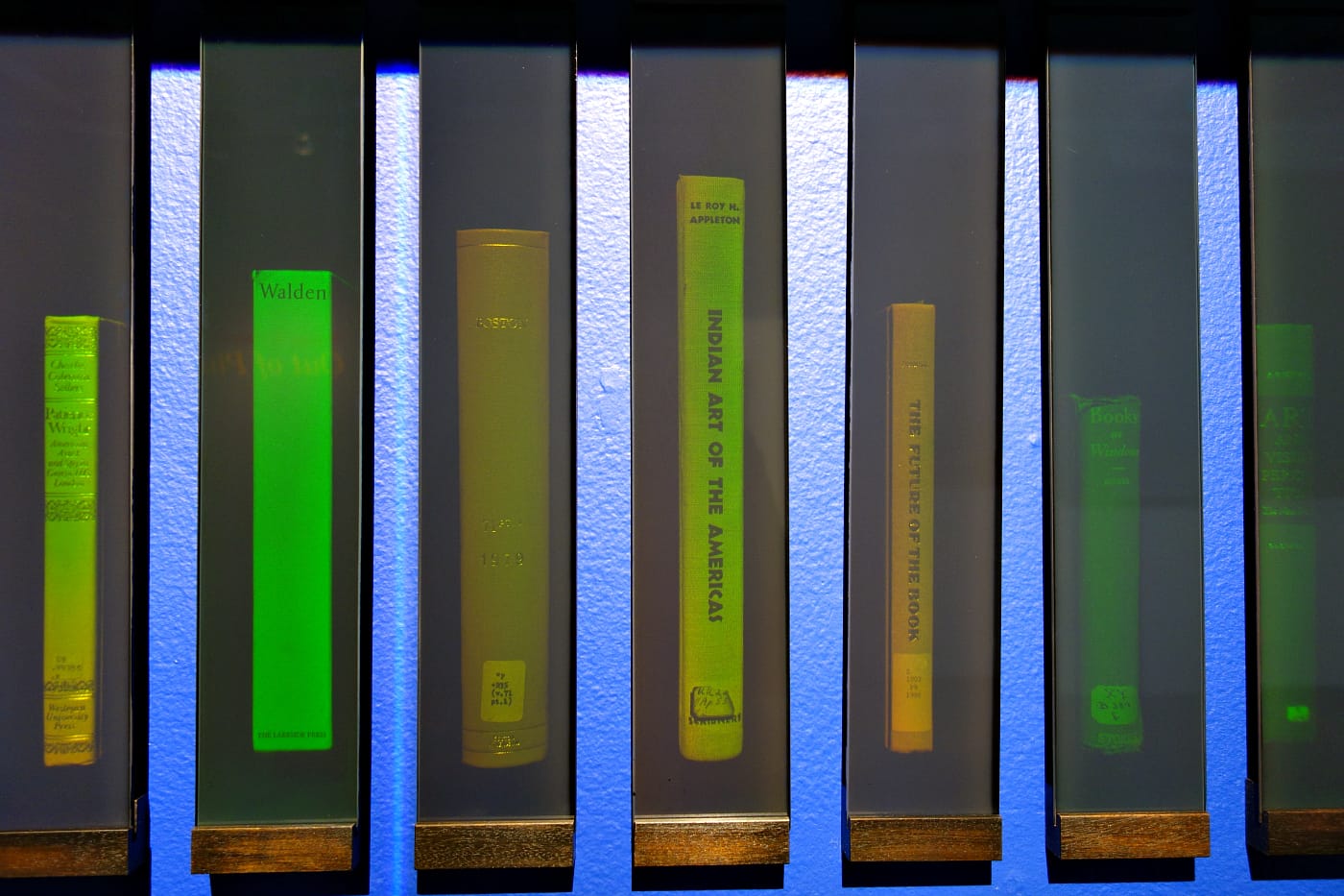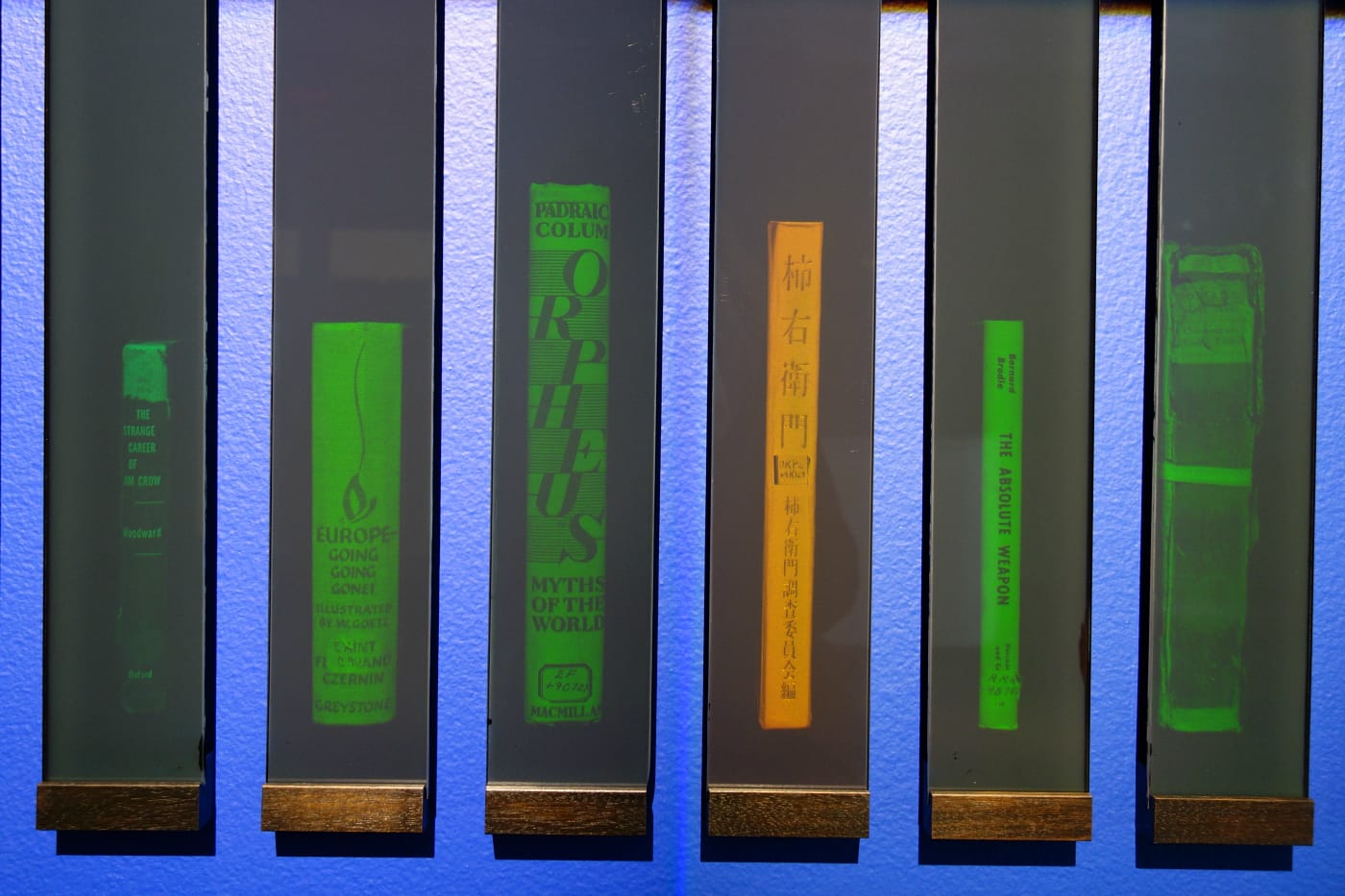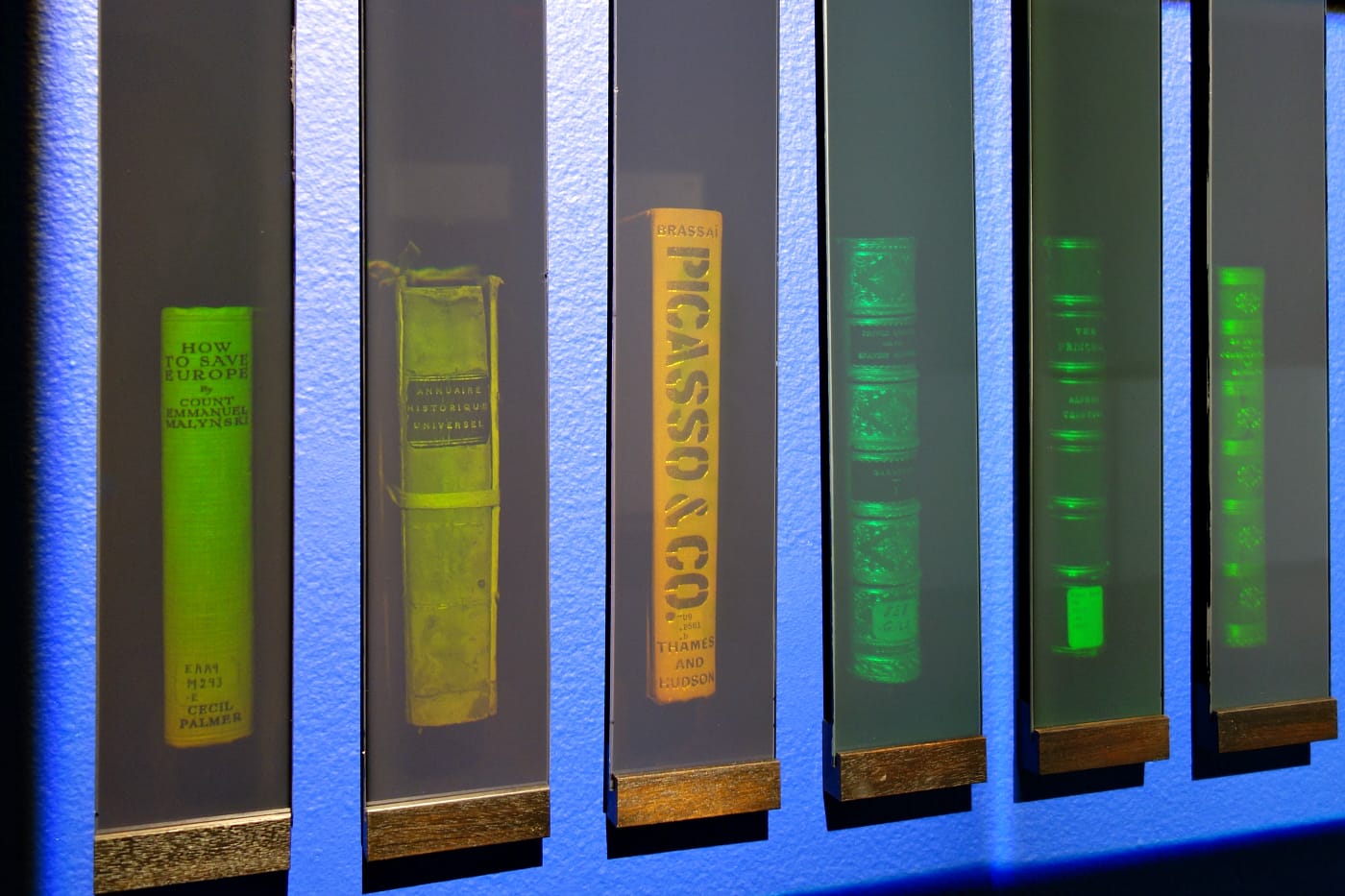 A shelf of 54 books glows in Magnan Metz Gallery, their weathered spines illuminating titles like Wonders of the Invisible World and The Absolute Weapon. On approaching this otherworldly library to examine a volume closer, it’s revealed that the books are all holograms, their covers receding into darkness.