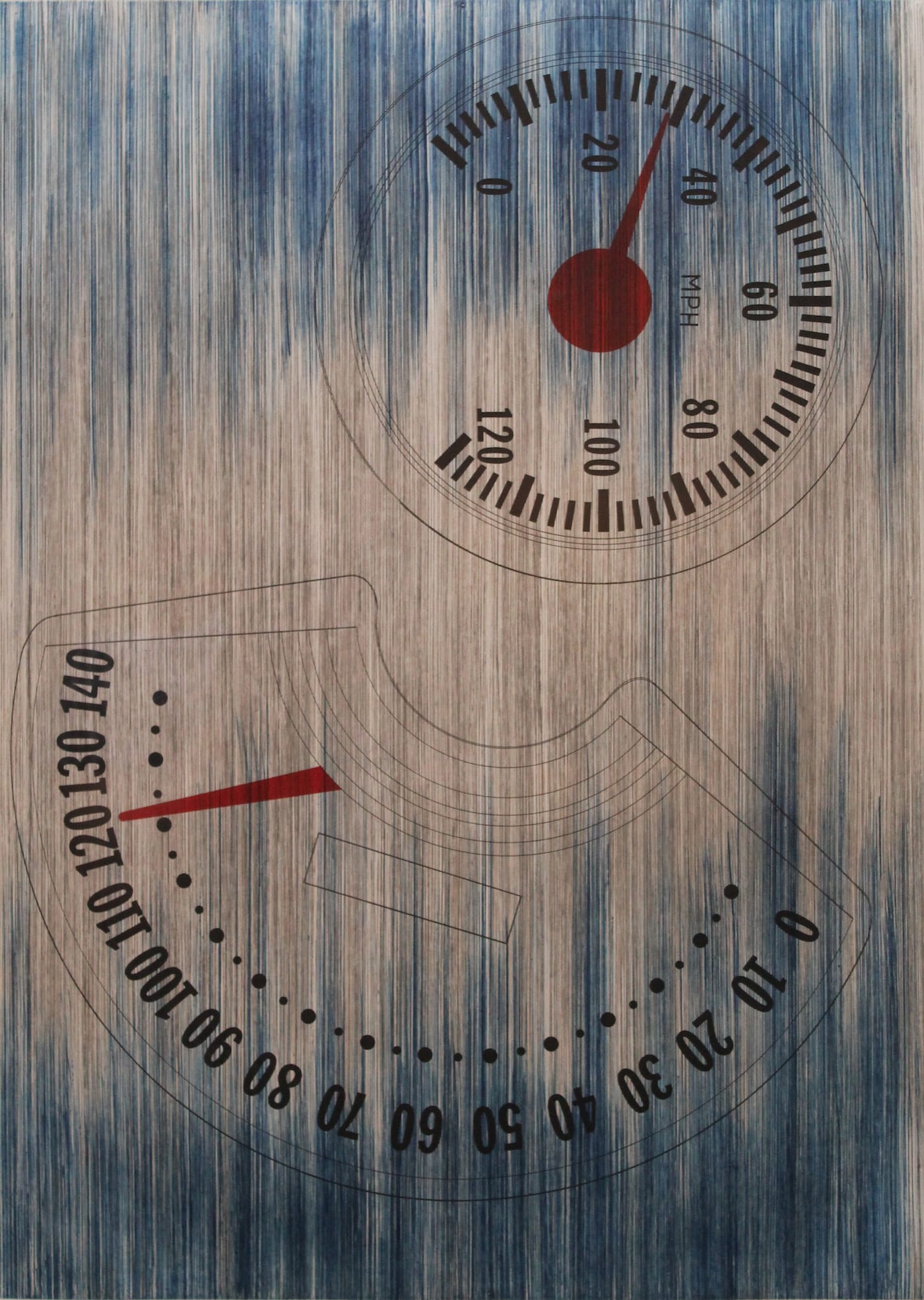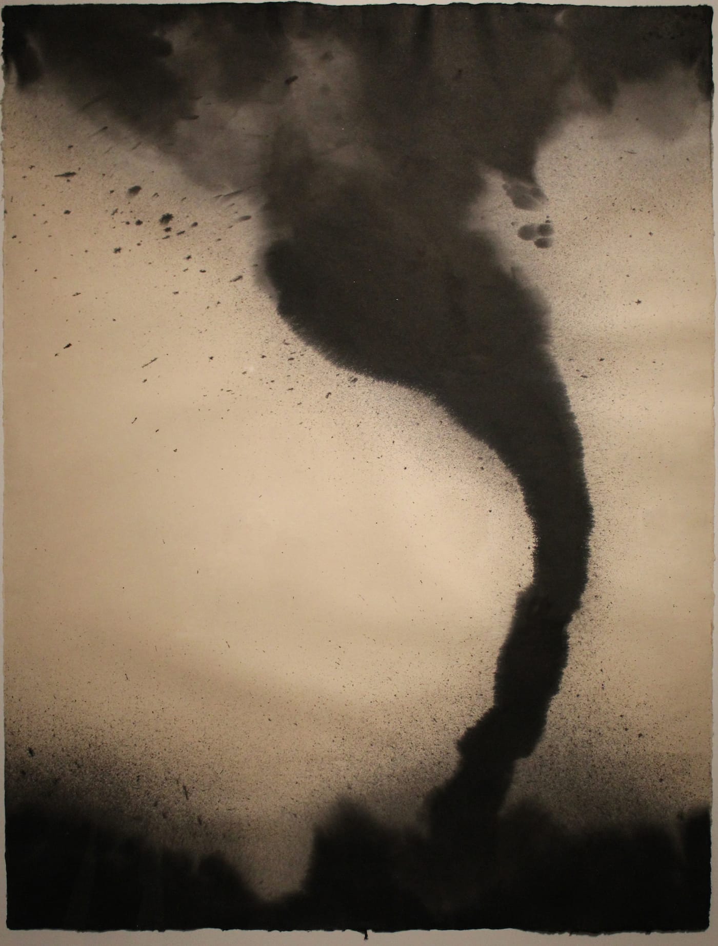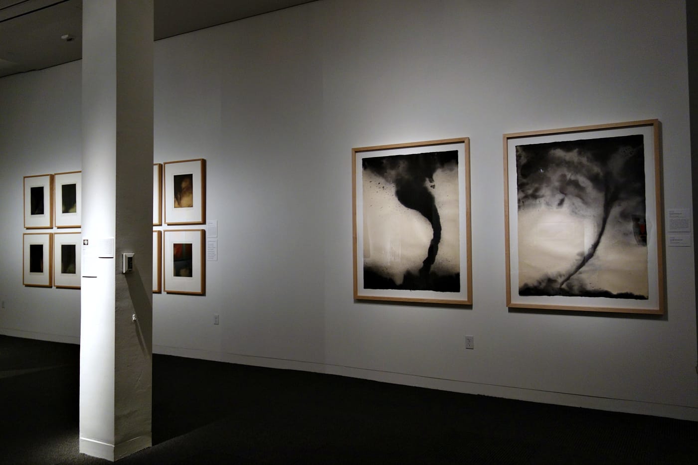 Road signs, speedometers, and the lonely gas station recur in Ruscha’s prints, paintings, and mixed media. Meanwhile, the FJJMA donation features a portfolio of Goode’s tornado images. Their clouds of Sumi ink often represent real Tornado Alley storms, and consider the unpredictability and status of this Western icon. Fittingly, Goode will be the 2017 juror for the National Weather Center Biennale at OU.