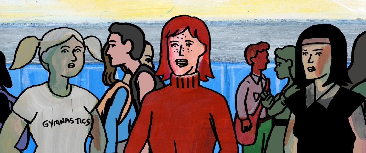 Cartoonist Dash Shaw’s first animated feature, My Entire High School Sinking into the Sea, opens with abstractions that gradually slide into distinction. At first, the bottom of the screen is covered with blue flames laid over a multicolored background of concentric circles and vertical stripes. Black silhouettes of falling bodies tumble in front of this backdrop, eventually replaced by the cartoon forms of young adults doing the same.