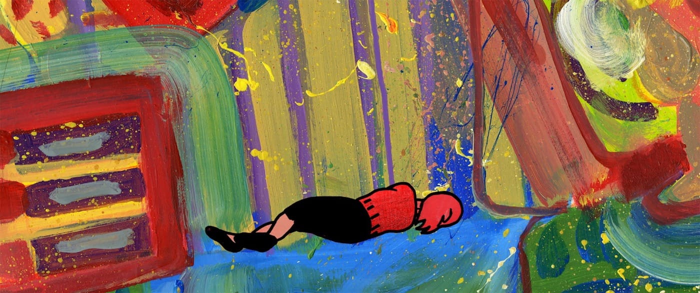 The film’s character design is, accordingly, very simple. Eyes are dots hooded by arches; their blinking is one of the faces’ only movements, along with mouths and brows. Bodies move stiffly when they move at all. However, Shaw’s relatively thick line is always in motion, reminiscent of the Squigglevision of TV shows like Dr. Katz, Professional Therapist and Home Movies; this technique makes the figures appear malleable. These lines are mere suggestions to border the colors splashed haphazardly on the screen with noticeable strokes of paint of scribbles of colored pencil. The characters’ colors change independent of the situation. Generic appearances make Dash and company into everymen and everywomen.