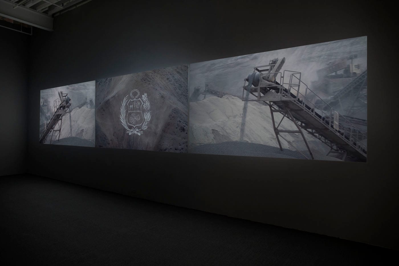 Katherinne Fiedler’s Erosión, a massive, three-panel video installation, shows the erosion of Peruvian archaeological sites caused by mining practices —specifically the country’s coat of arms, depicted on the side of a rolling mountain in Cuzco. It appears to be shot from a drone, the views sweeping and the symbol fading. Mining practices are contentious; still, the image itself is slow and mesmerizing. Faced with an uncomfortable truth, you’re calmer for it.