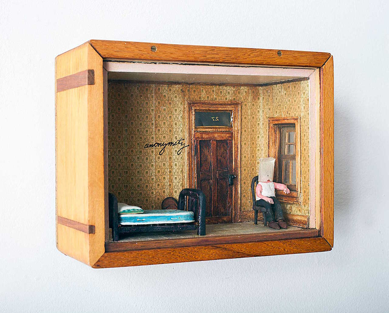 “Anonymity” — a diorama of a man sitting in a room — is dated 1980 and measures 6 1/8 x 8 1/8 x 3 1/8 inches, about the size of a thick but not very large paperback novel. I suspect it is about the size of my copy of William Gaddis’s The Recognitions, but a bit thicker. A man in a sleeveless white t-shirt and dark pants is sitting on the right side of a wallpapered room, by the window of what is likely a rooming house, his left arm resting on the sill. He faces the viewer, holding a cigarette, but there is a bag over his head, making it difficult for him to smoke. On the left side of the room is a bed with a mattress and pillow, but no sheet. There are no knick-knacks, no signs of a life lived. Instead, the word “Anonymity” is written in large letters on the back wall of the room (diorama). Because of the diorama’s size, you feel like a giant staring into a tiny room in which the lone individual, whose eyes are covered, is completely unaware of you. Behind him is a brown door with a glass transom on which the number 27 is painted in gold and, of course, in reverse.