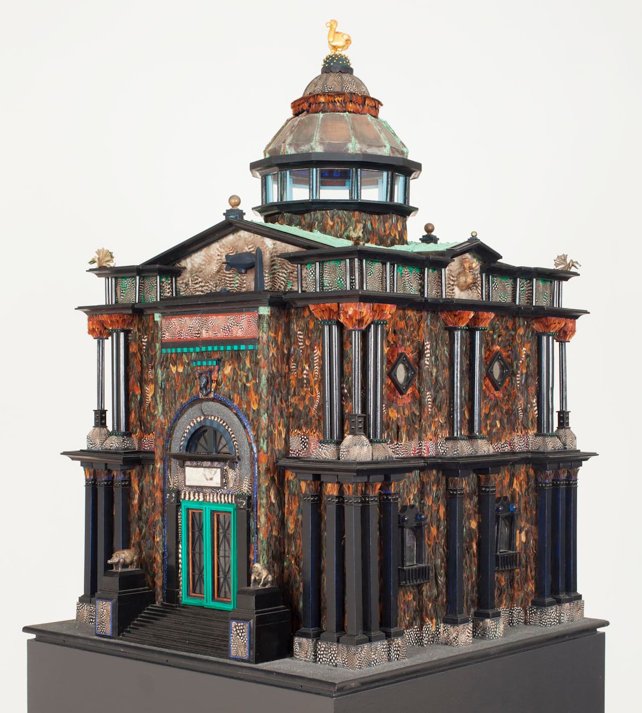 Beck’s “DODO MUSEUM” (1980) — an ornately appointed gothic building partly covered with feathers — contains the artist’s version of a life-size skeleton of a dodo. The sculpture comes complete with its own attached pedestal and stands more than seven feet high. The viewer peers in through the open doors, craning this way and that in an attempt to see everything inside, and there’s a lot. The outside of the building is also full of details, from the feathers covering some of the walls, to the perched gargoyles, to the round mirrors inset on the side walls, to the monkey guarding the museum’s entrance, to the copper sheeting on the roof, to the golden dodo perched on the top of the building. And this is not the half of it.