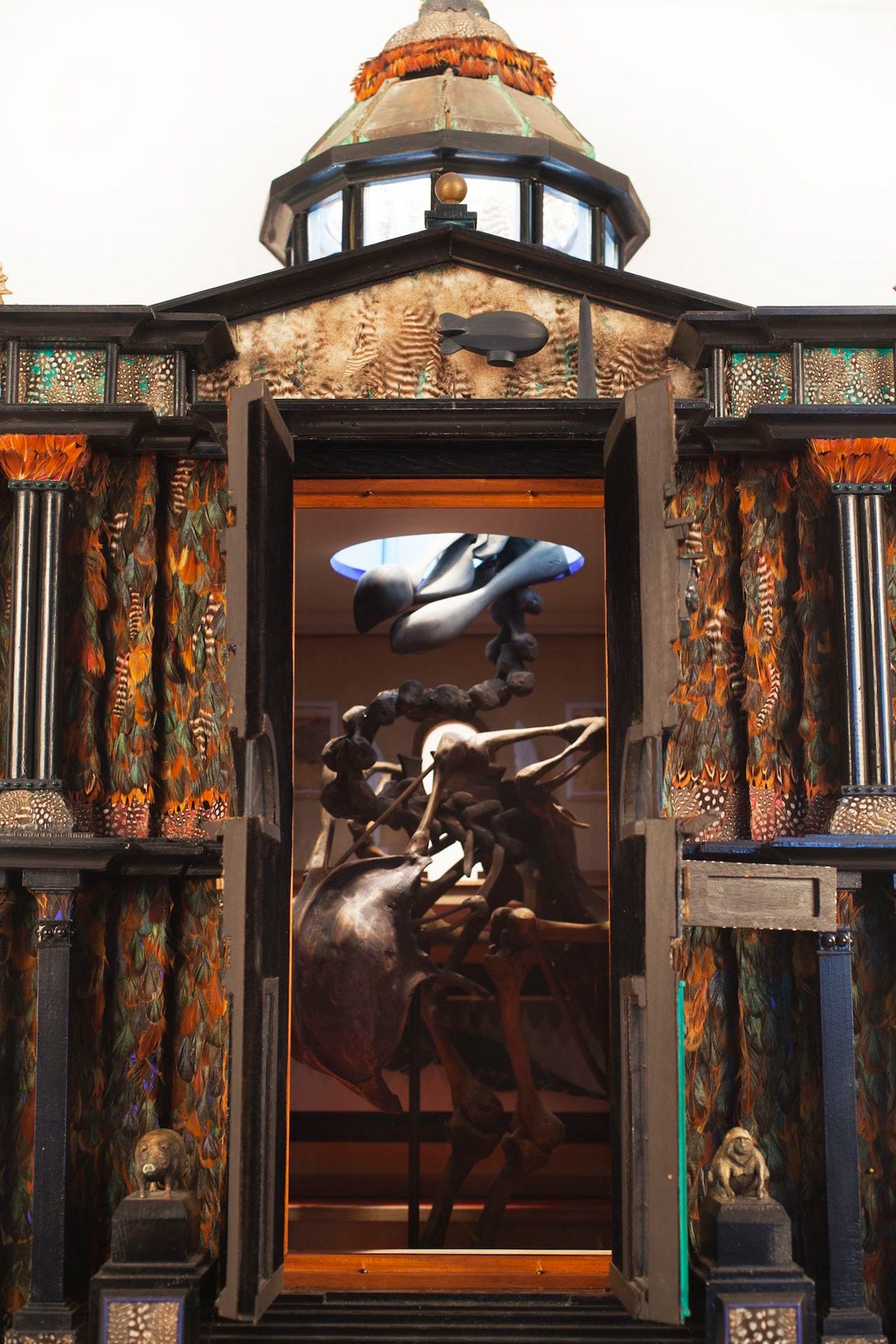 Beck’s dodo skeleton rises from floor to ceiling, like a dinosaur display at the Museum of Natural History. It is all made up, of course, because no complete skeleton exists. Everything we know comes from inaccurate visual records and scant physical proof. On the museum’s interior walls — and barely discernible — are small paintings based on the “Unicorn Tapestries” on display at The Cloisters in Upper Manhattan. The comparison of the dodo to the mythical unicorn reminds us that for a while people thought the dodo was a myth. Breathtakingly attentive to details, Beck has memorialized a creature that humans quickly and thoughtlessly made extinct. The dodo may look dumb and foolish to us, but our own foolishness turns out to be monstrous. Beck’s devotion to this impossible recreation is a funeral hymn full of whimsical visual notes, a gentle reminder of human waste and greed.