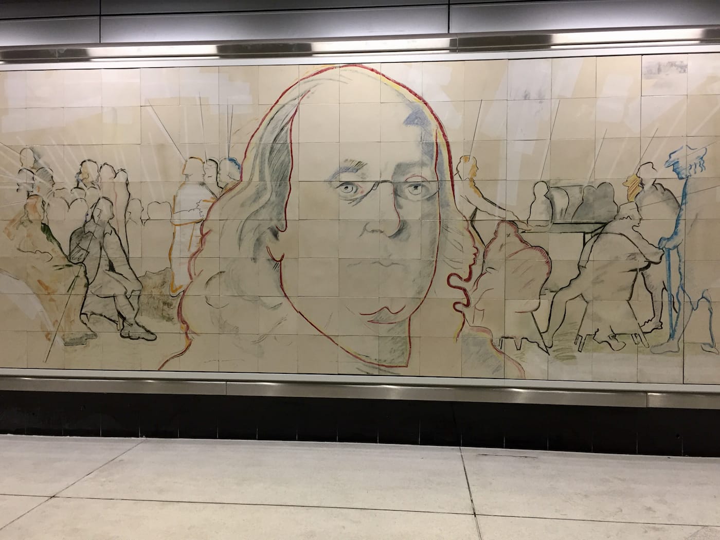 As its name suggests, the work, divided into three 25-foot-long panels, pays homage to Philadelphia through an eclectic variety of local, historical icons. Among these are one massive portrait of Benjamin Franklin, a rough depiction of the Mummers Museum, and homages to the African-American abolitionist James Forten and the photographer Thomas Eakins.