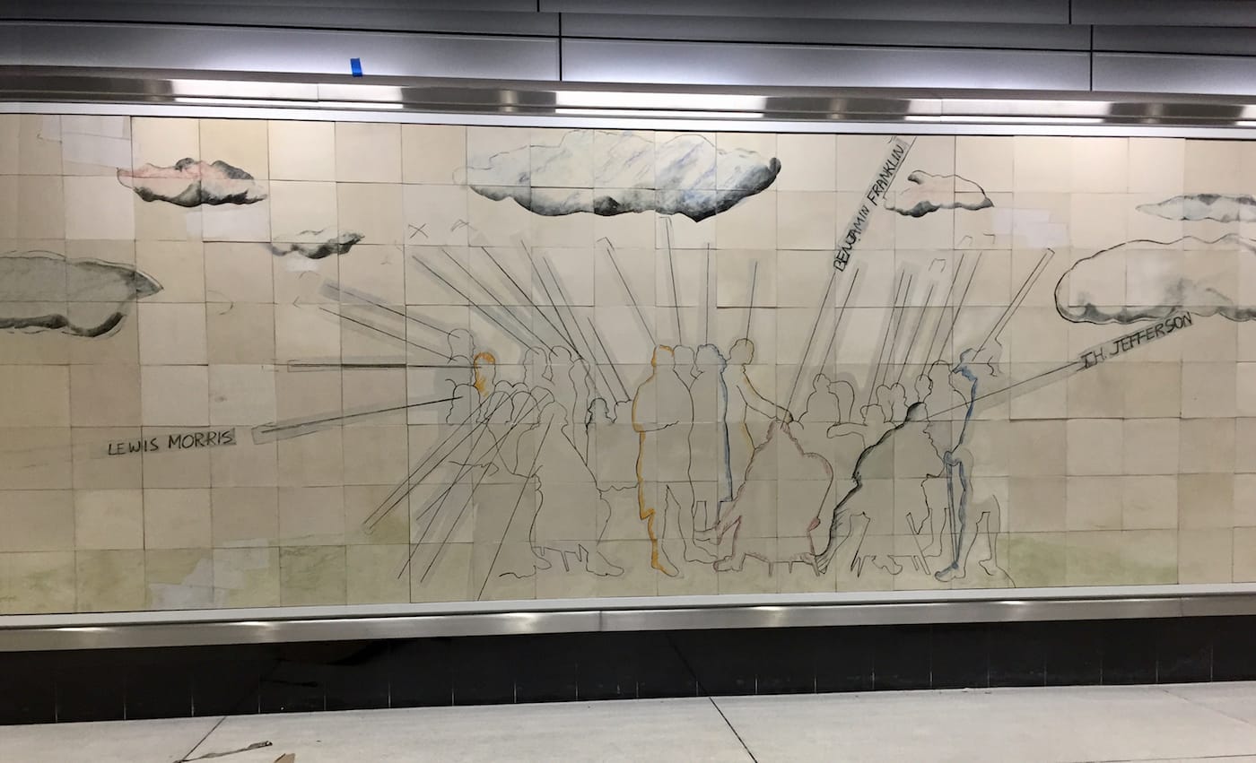 The artwork now gleams in a concourse of the City Hall SEPTA station, having undergone its first-ever restoration. It originally graced a similar site for those in transit: a passageway in the Gallery, a major mall at Market East. When the mall was under construction, its developer had commissioned the artwork through the Philadelphia Redevelopment Authority’s Percent for Art Program, which often works with private developers to commission public art on their properties. The program has been trying to restore or relocate the piece for many years as the site has evolved and businesses have crowded the area around the artwork.