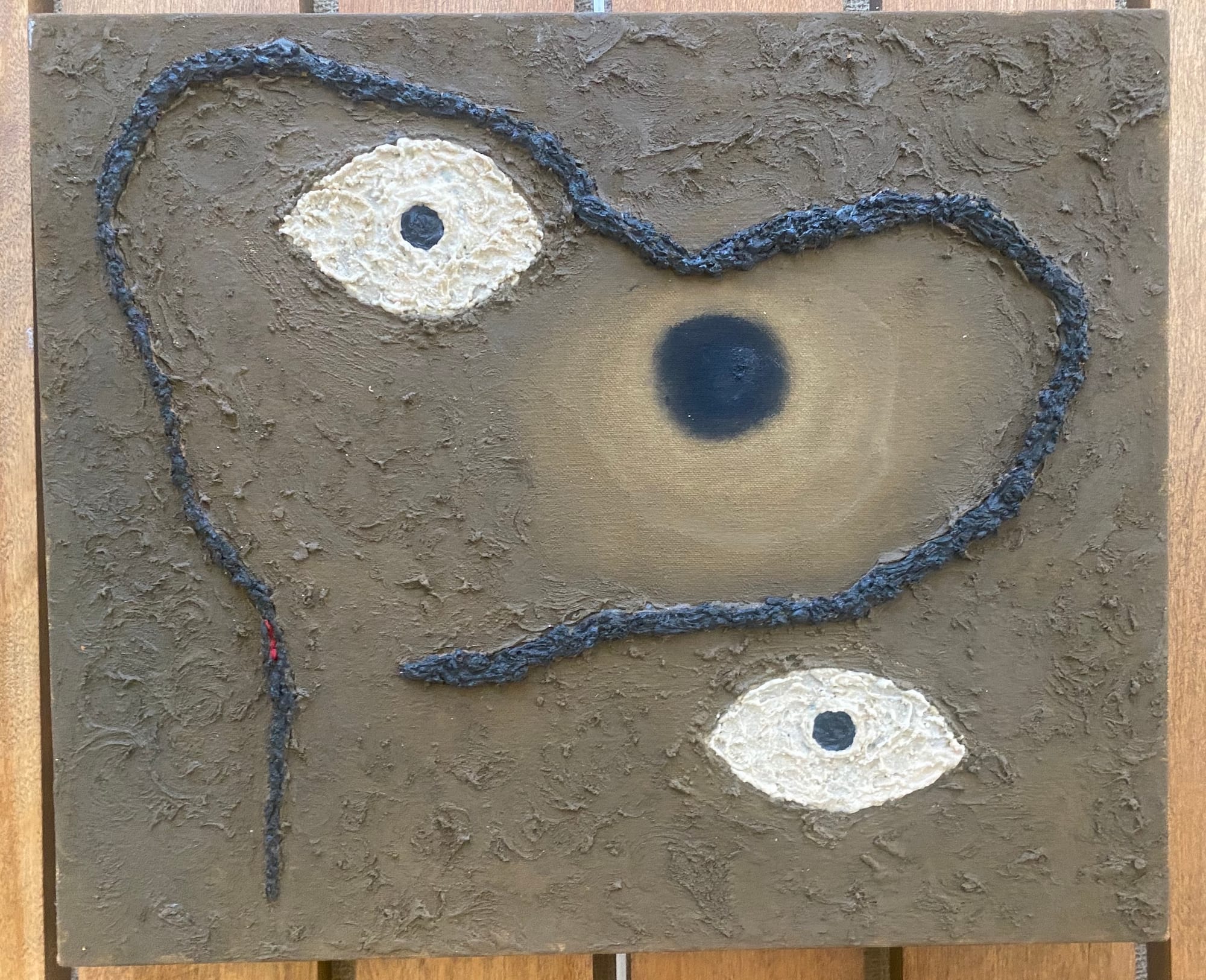 Cox’s ouroboros encircles a daisy, backgrounded by brown earth. Per the exhibition description, the artist grew up in a cult, where all that she was “taught to be afraid of were actually things and people who were good for her.”