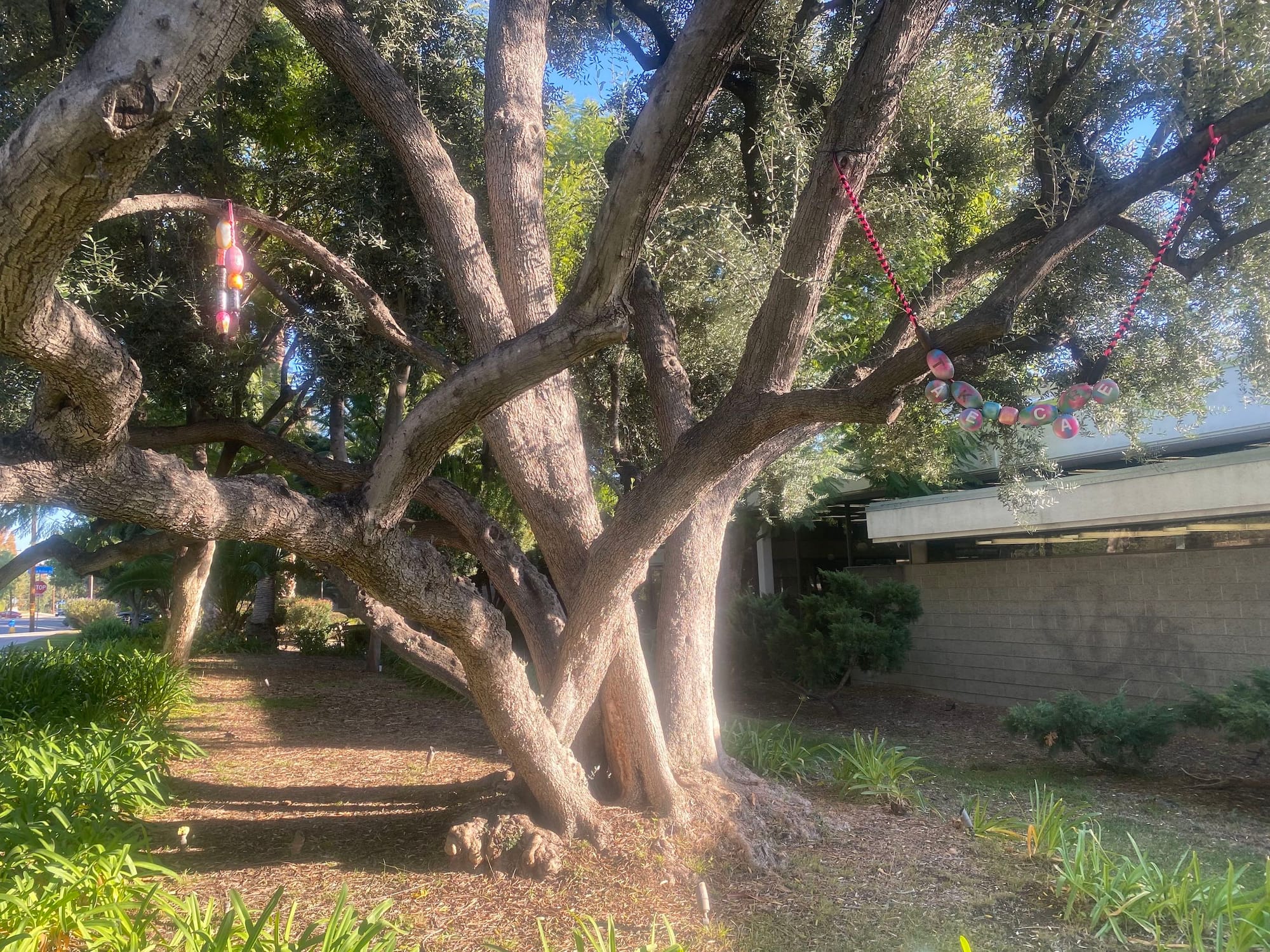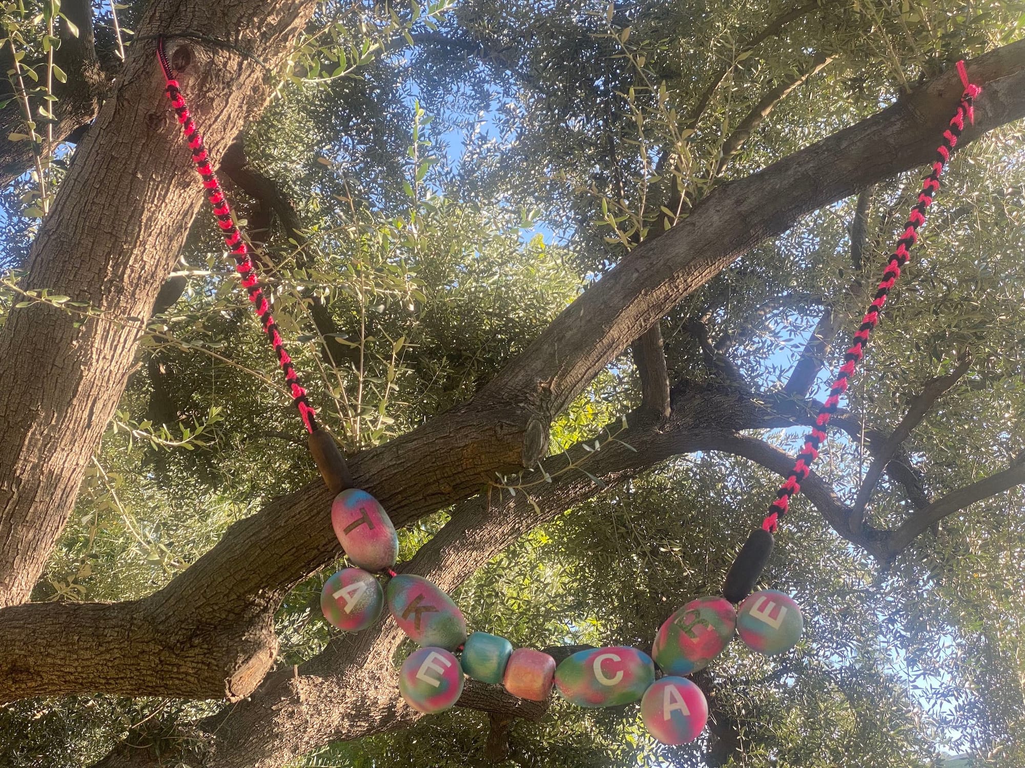 Outside the library, Ali Prosch’s oversized “Friendship Bracelets for Trees” hang from the property’s oldest tree (predating the library itself, whose history dates back to 1926). The popular craft started as a protest symbol and then extended to a general activity between friends and loved ones, especially children. Prosch worked with her daughter, Lucy, to create the three massive bracelets, one of which carries the phrase “Take Care” in giant beads and red and black rope.