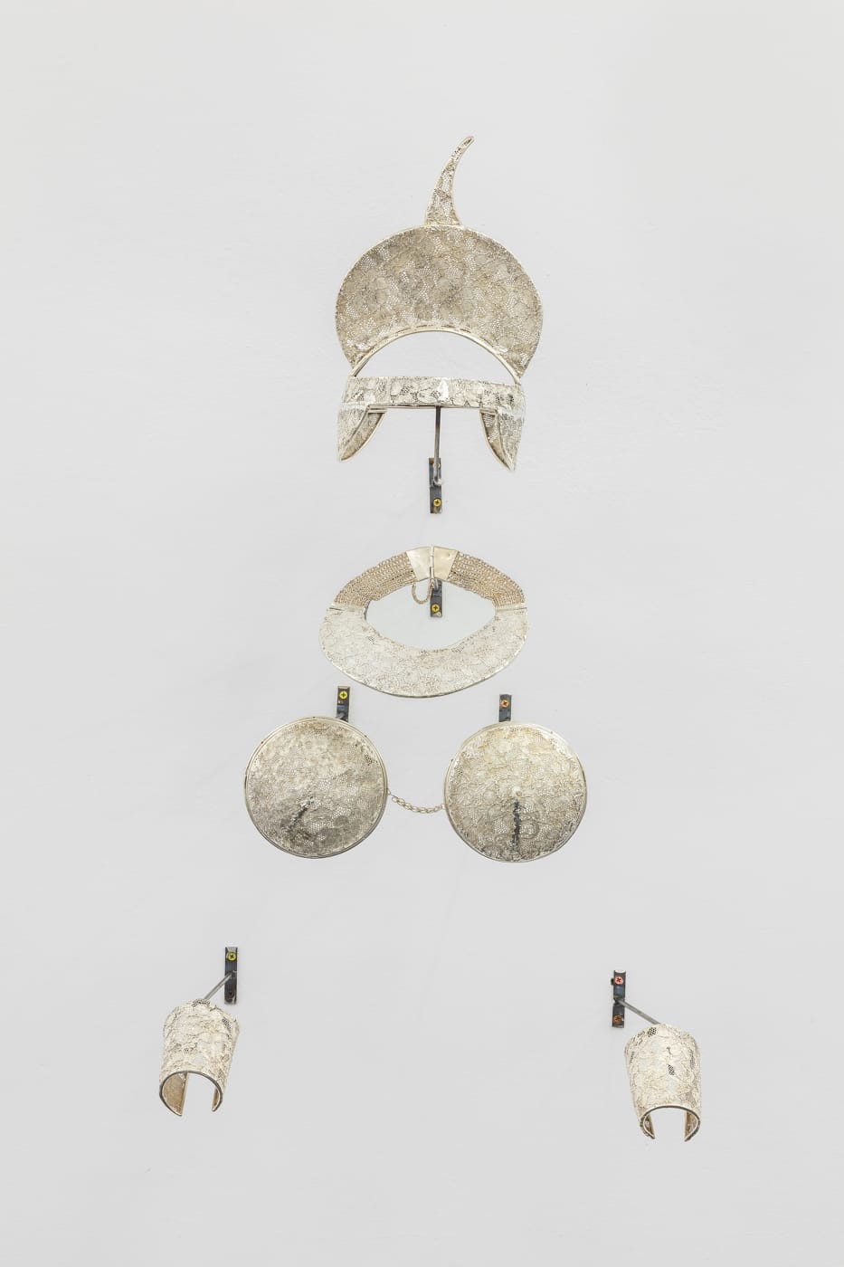 Pellicer’s costumes for the imaginary cinema, made using traditional metalworking techniques, could pass for futuristic war fatigues for Xena the Warrior Princess, in a world in which explosive ordinance warfare has been eradicated and all battle takes place between telepathic superhumans. Maybe in a world in which the stupid greediness of men has been eradicated too. The pieces are utopian and resonant. And it’s apparent that, for the construction of these immaculate forms, the artist benefited greatly from the gifts of Mexican artisans and their generations of knowledge.