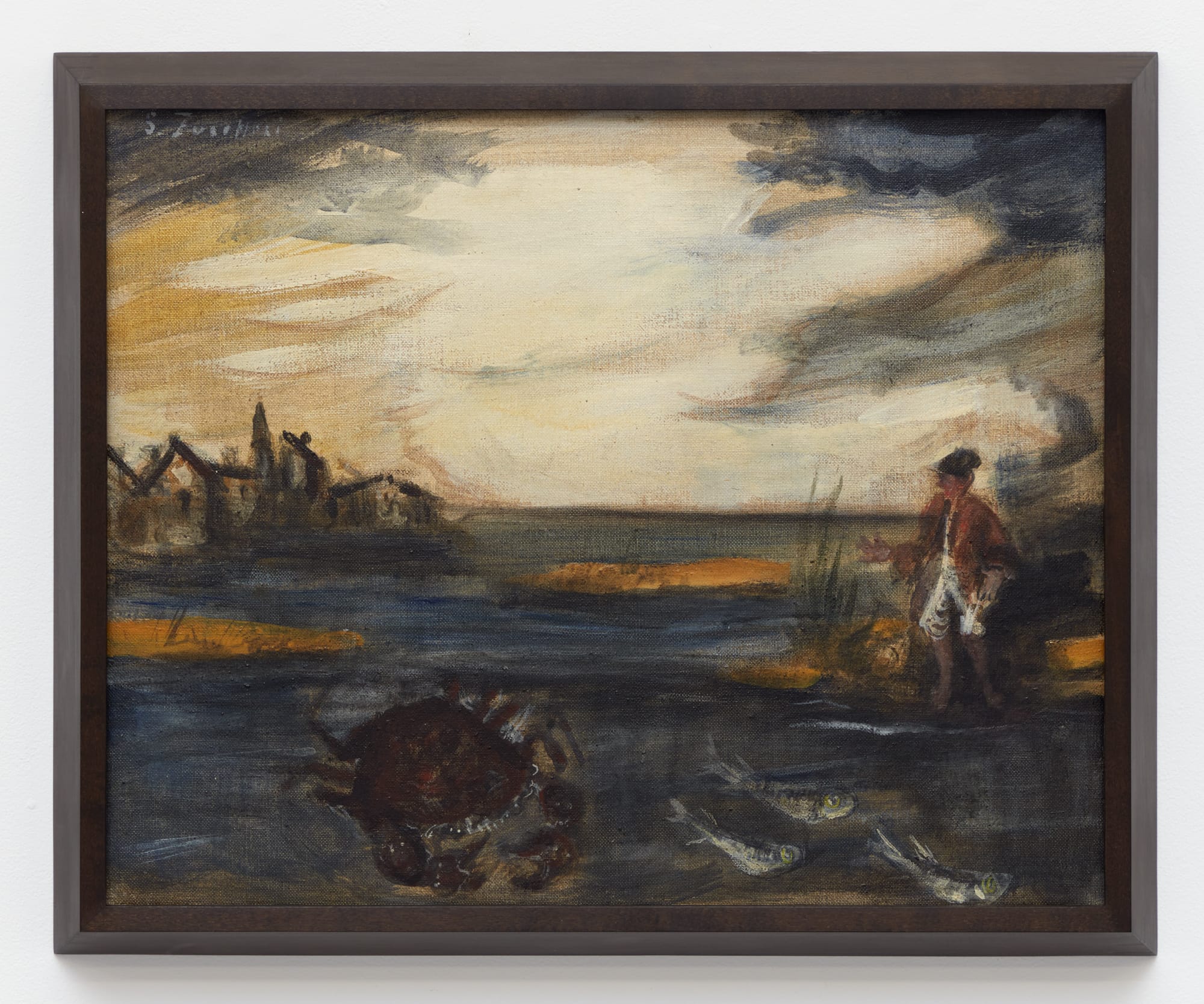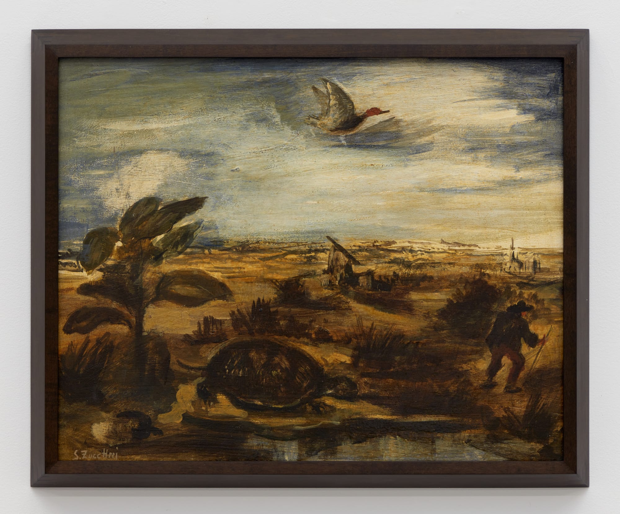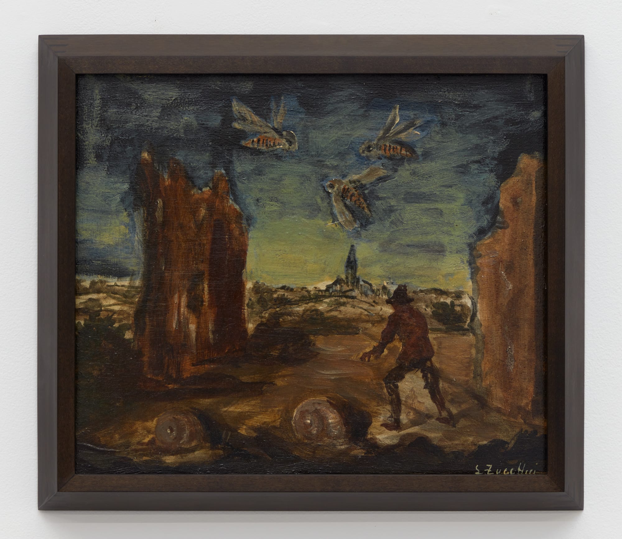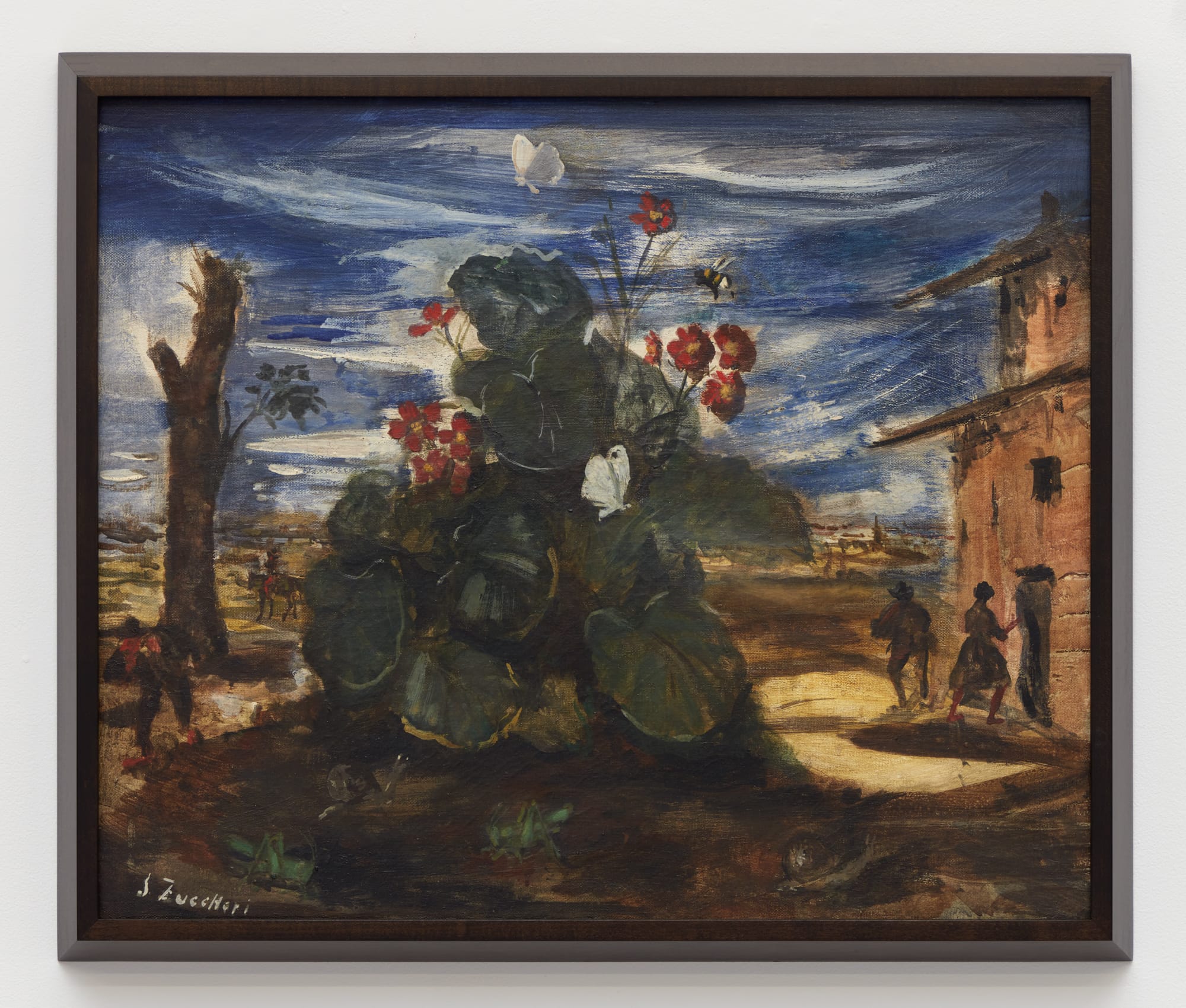 Zuccheri’s dark palette, rendered in thick brushstrokes that color the land a muddy ochre, the turbulent skies gun-metal gray and blue, amplifies this brooding effect. A figure perhaps struggling against the wind grips a broom beneath a glowering sky while impossibly large grasshoppers skitter at their feet; a house-size primrose flowers while people go about their tasks unfazed. The disproportionate relations between humans, fauna, and landscape spark, it seems, little alarm in his figures. In Zuccheri’s rustic domain the fantastical is domesticated; oddity is reality’s baseline, so a colossal crab is merely a generous feast soon to be consumed.