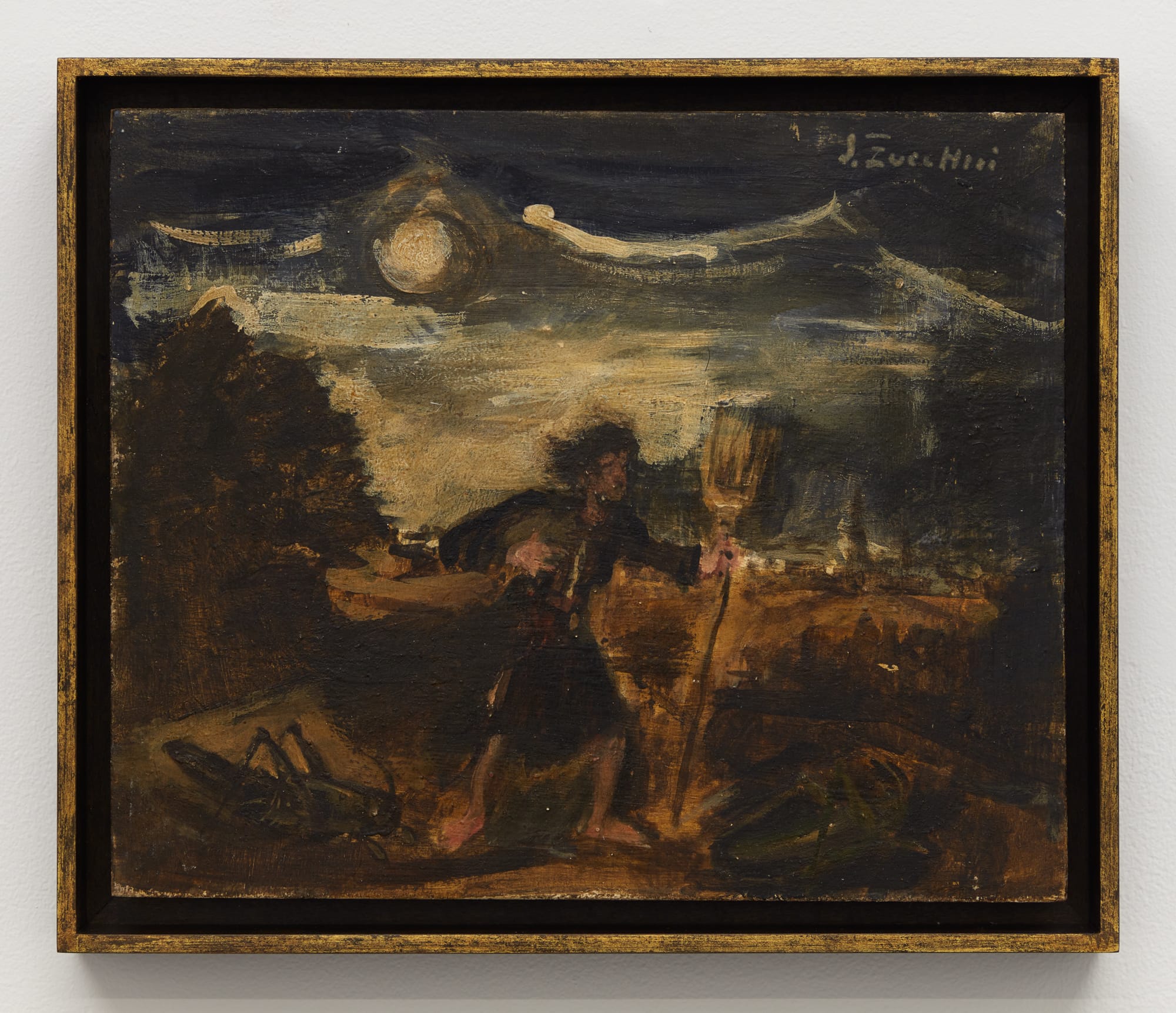 Luigi Zuccheri’s moody landscape paintings, now on display at Karma gallery, radiate an unnerving allure. In his impressionistic rural scenes a farmer carry stalks, fishermen edge toward the banks of streams, ramblers clutching walking sticks make their way on roughhewn paths. Typically these figures might betoken pastoral equanimity but Zuccheri, born in 1904 in the Friuli region of Italy, has introduced disruptive element — a menagerie of oversized creatures, plants, fruits, and vegetables that dwarf the humans with whom they share the canvas.