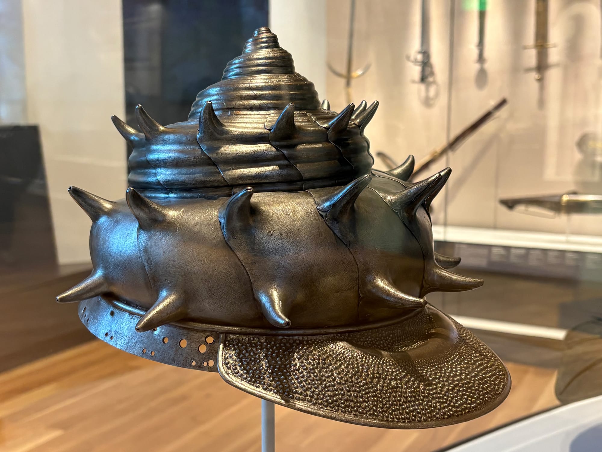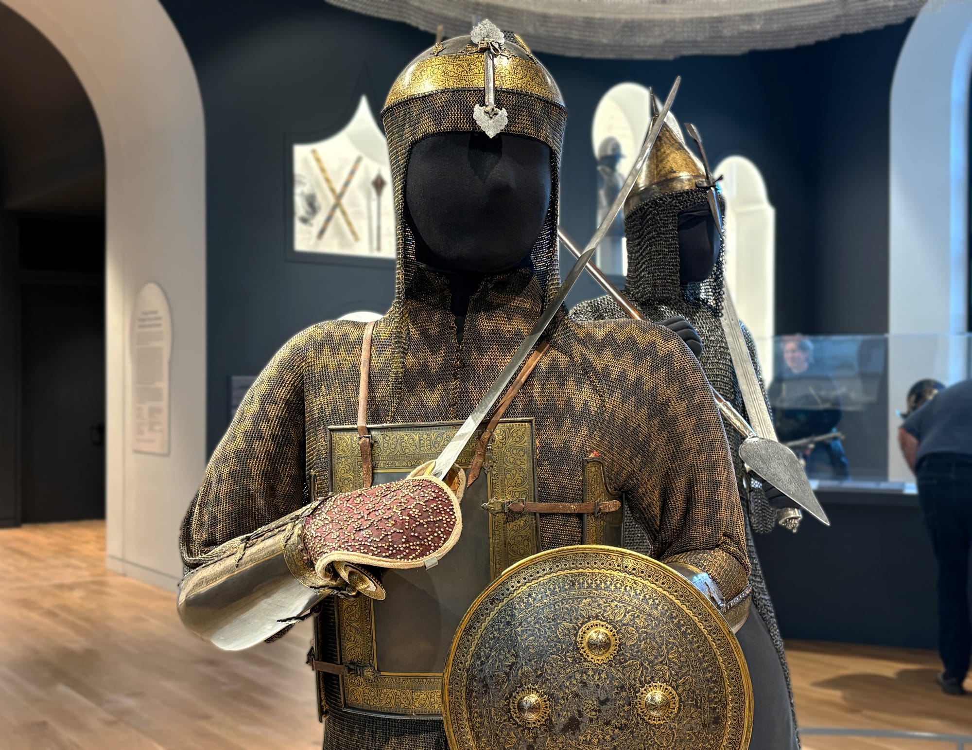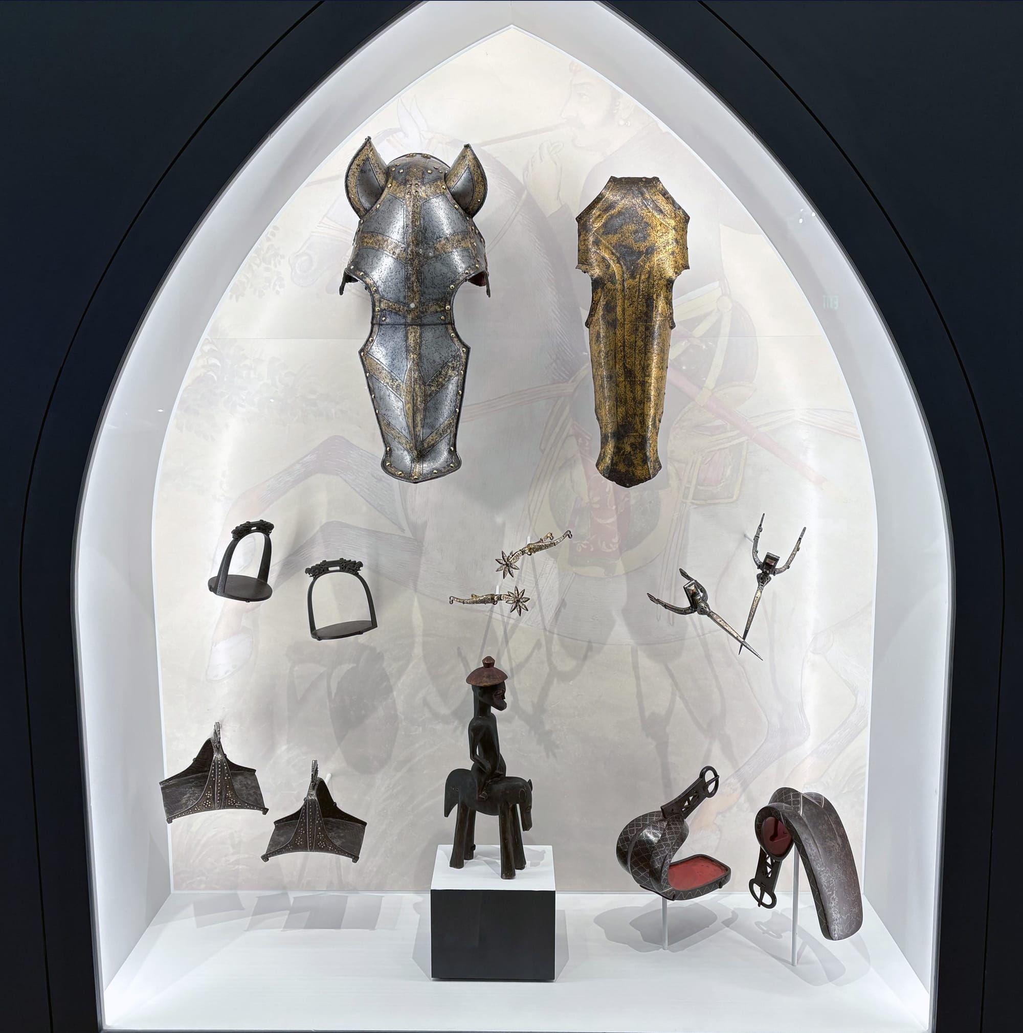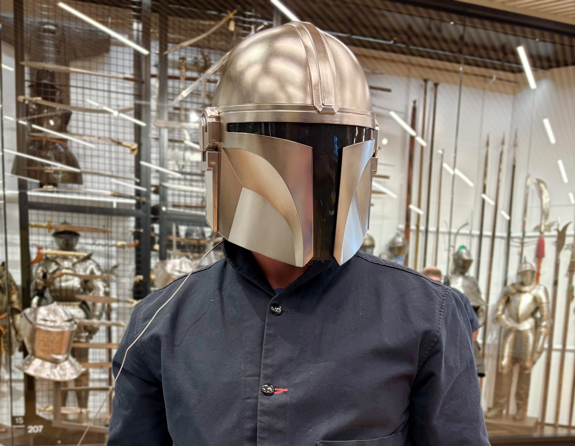 Although medieval European armor appears in the galleries, it is presented with equal billing alongside fascinating works from India, Japan, Egypt, Sudan, Ancient Rome, Classical Greece, and many other places across the globe. Indeed, whatever our modern-day associations may be, one of the earliest known depictions of armor is on the Sumerian Standard of Ur (modern Iraq), which dates to around 2550 BCE and is now held by the British Museum. The WAM presentation carries the history of armor and arms into the present. Visitors can even try on a Mandalorian helmet if they want to engage with the fictional future of the art.