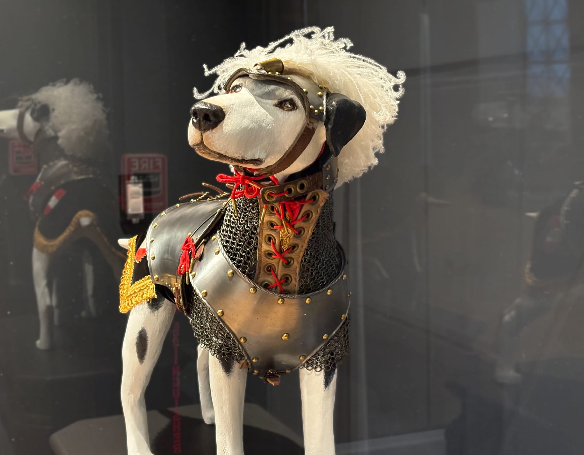The displays and gallery labels point to the fact that armor was not just for use in battle. Beyond warfare, there was a pageantry surrounding the display of this metal fashion, which was often worn within tournaments and during parades as well. I was impressed by the horse armor and spurs on display for viewers, and even more delighted by the “dog armor” based on a 16th-century medieval European armor suit for a Spanish hunting dog. The Met’s former official armorer (that is a real job!), Leonard Heinrich, designed it for the Higgins Museum in 1943.