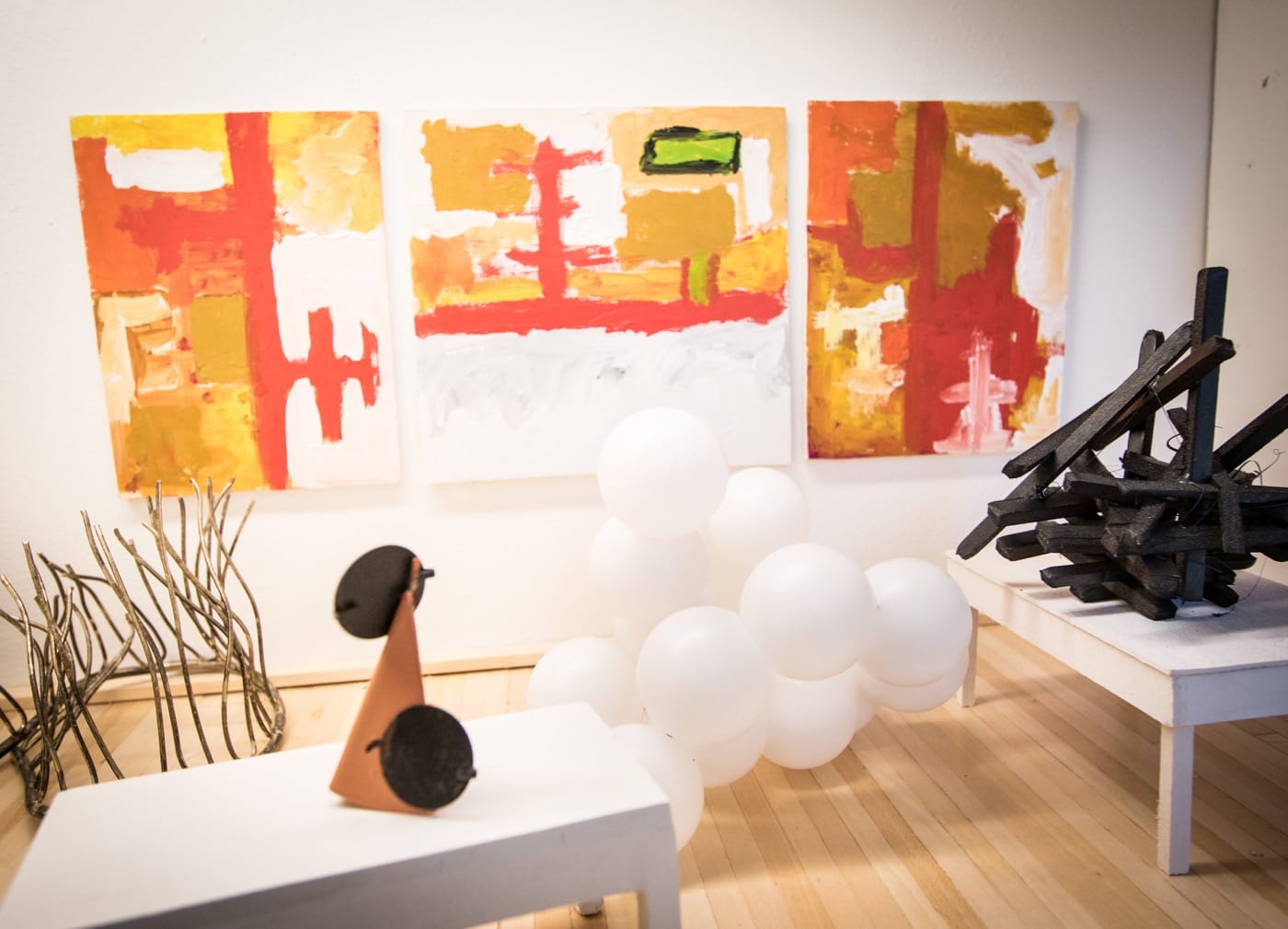 The galleries show artwork in a variety of media. A colorful wood assemblage hangs on the wall next to a monochromatic red sculpture on a white table. In another gallery, a metal mobile hangs in front of a painting. The exhibits laid