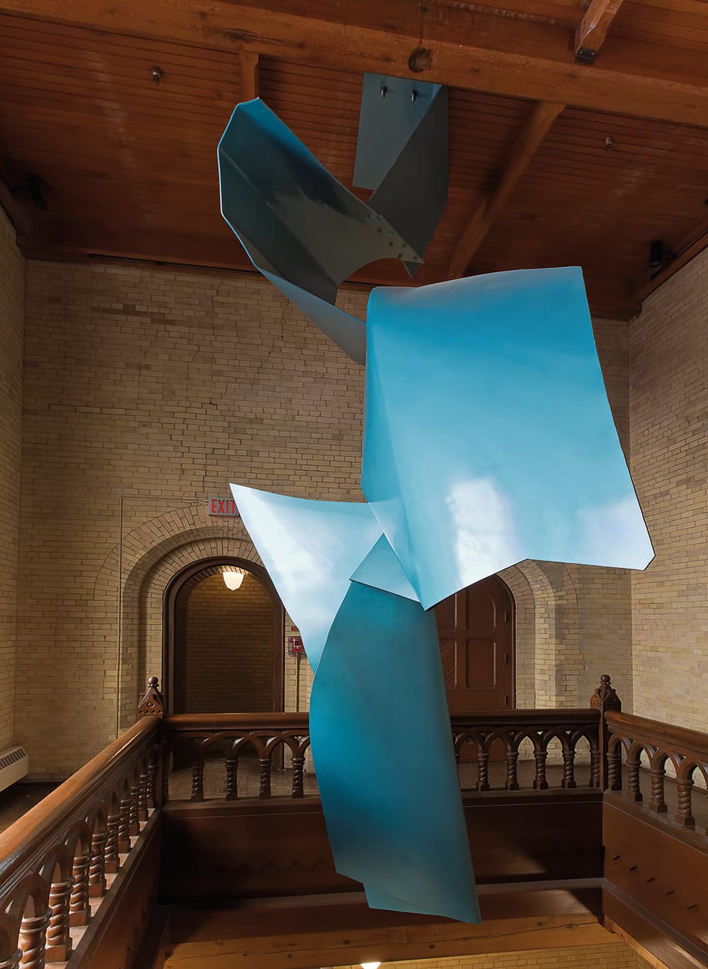 Murray’s sculpture certainly manages to develop a unique perspective, despite synthesizing many aspects and themes of contemporary sculpture emerging from New York in the 1960s and 1970s. Many of his works from the 1960s are minimal, some recalling Calder in their stark geometries, bright monochrome surfaces, and tense angles. In the waterfront idyll “Ferus” (1963), for instance, a tall, red cylinder seems almost to lift an I-beam-shaped dance partner above its head; and the bright yellow “Cumbria” (1966-67), which was installed in Battery Park City as part of the Art in Public Places program, resembles a ski launch. Other works evoke entropy and movement. Murray’s early stint as a rigger in the Royal Canadian Air Force introduced him to metalworking and fabrication, skills he would use throughout his art career to create astonishing, delicate ripples and crumples in structural steel and cast bronze. His 1980s works feel more figurative, resembling waves and blocky waterfalls, and bearing titles that allude to nature, such as the wild “Cascade” (1983), in which sheets of blue-painted aluminum hang from the ceiling of a vaulted chandelier space in University College at the University of Toronto, like a chunky strand of cut construction paper. (Cascade’s installation is temporarily closed due to University College Building Revitalization construction.)
