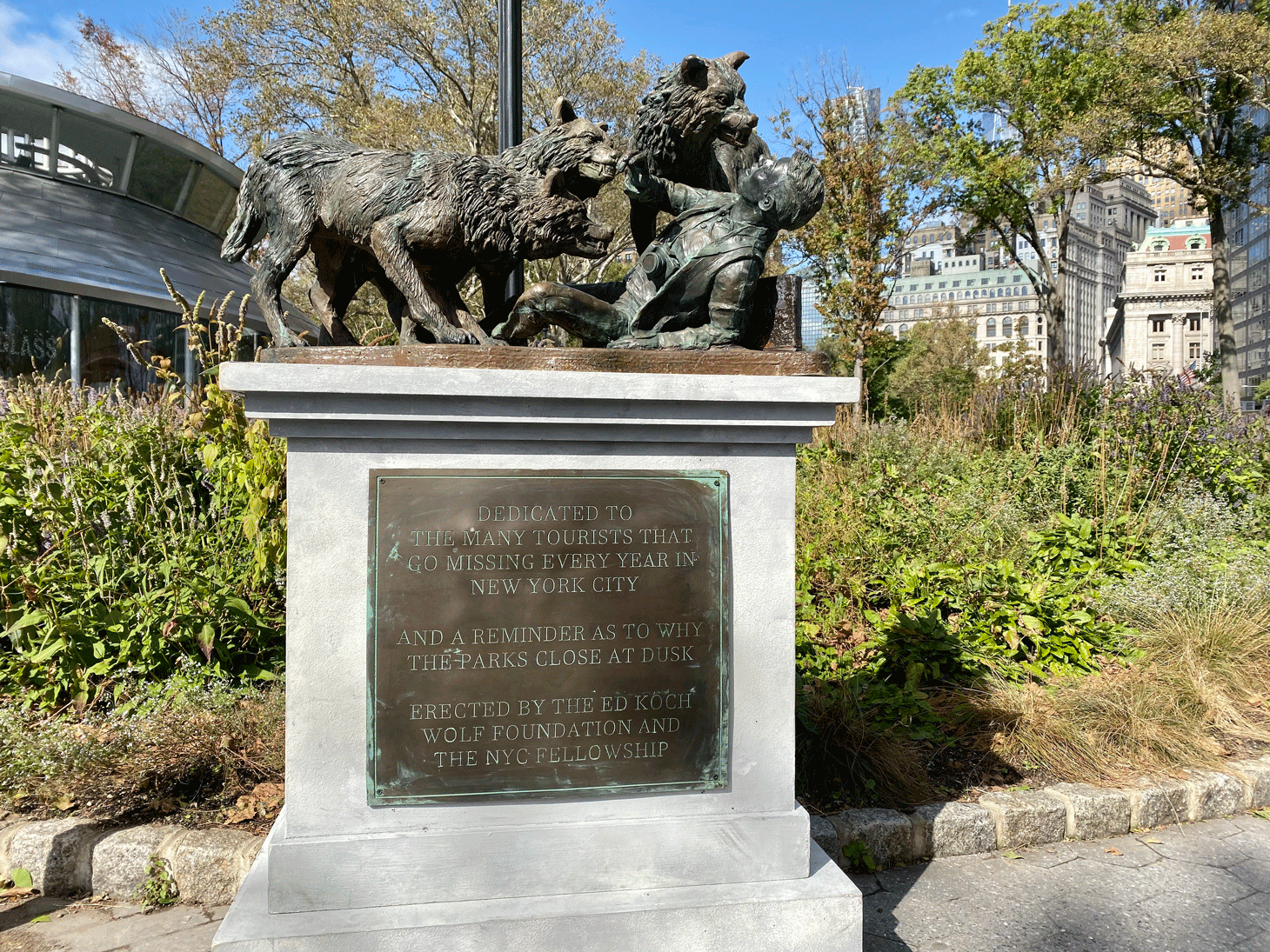 The monument, erected by the Ed Koch Wolf Foundation, is “a reminder as to why the parks close at dusk.”