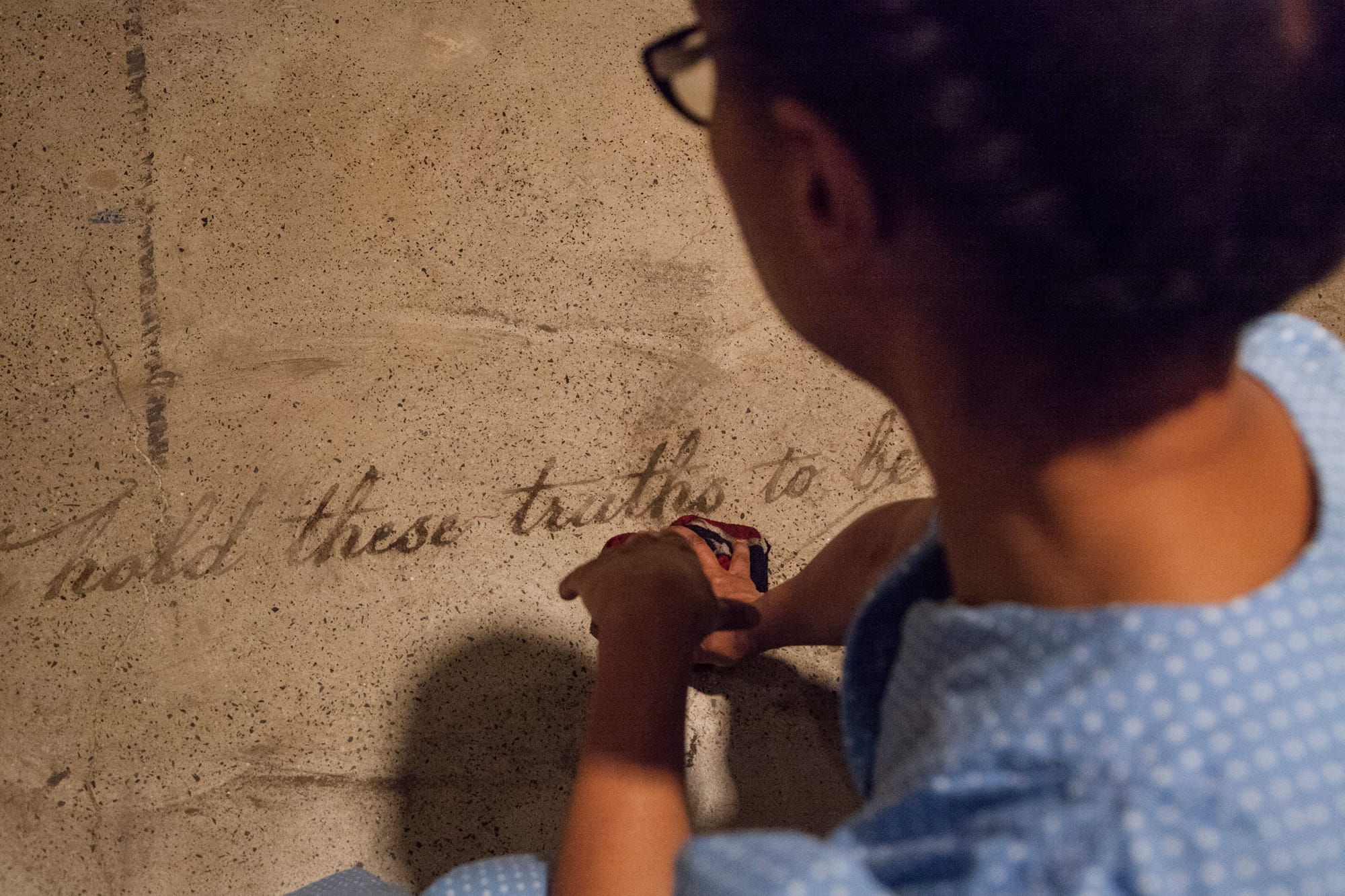 On the tiles of the gallery, the preamble of the Declaration of Independence loops around, covered in dust from Philadelphia’s historic Independence Hall and Declaration House, materializing the historic shrouding of democratic ideals under America’s historic racism and continued legacy of white supremacy. Clark mops up the floor, a symbolic cleansing of the Confederacy, and the preamble becomes more legible as she cleans. Rather than erasing the reality of the Civil War, Clark cleans up the revisionism that has allowed Confederate soldiers to remain memorialized as rebel heroes.