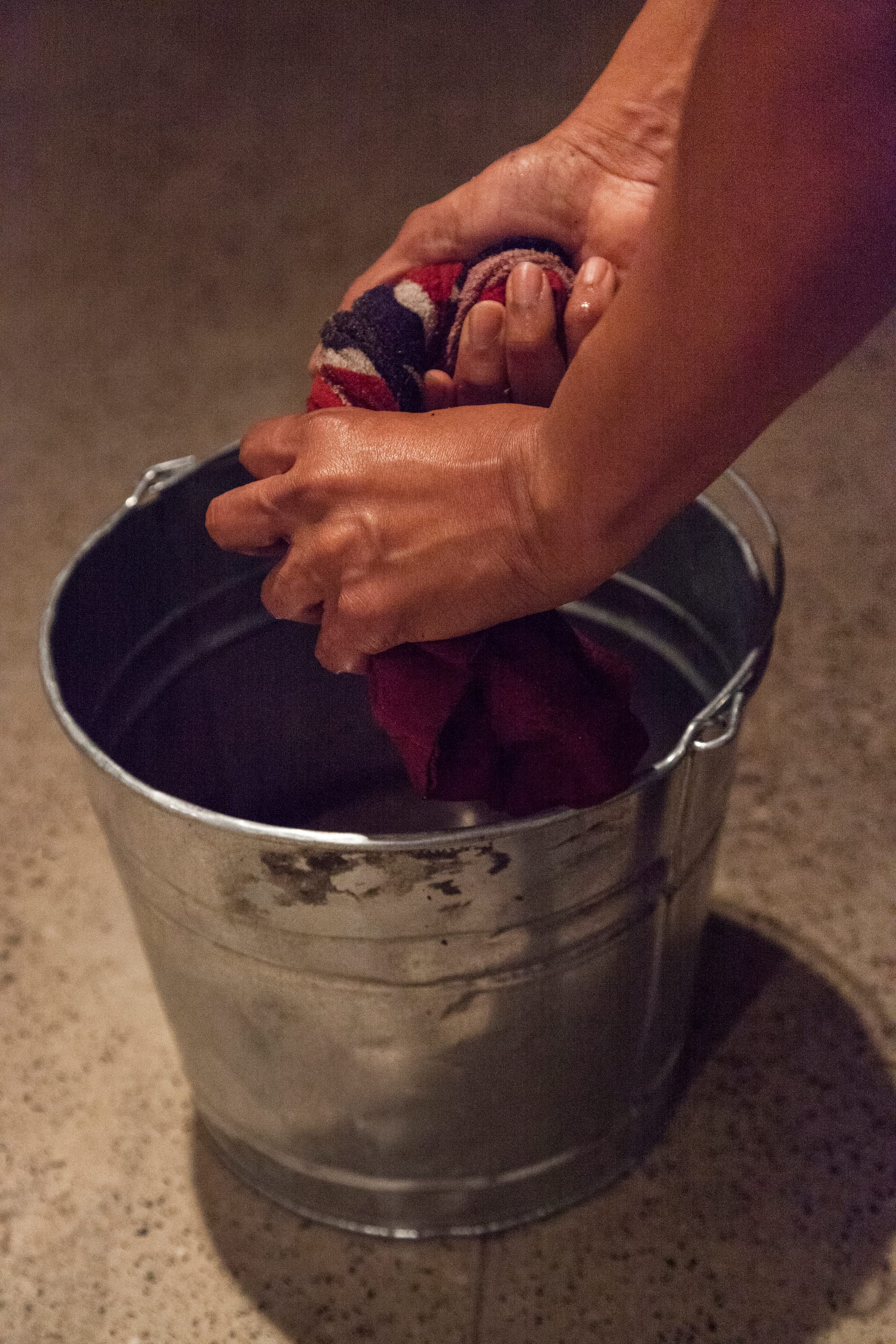 The truce flag was, in its original intention, woven as a dishcloth. Its waffle weave was meant to absorb and clean (which, in a deficient way, it did). Now, Clark is utilizing the flag in an attempt to further clean up the history of continued racism which followed.
