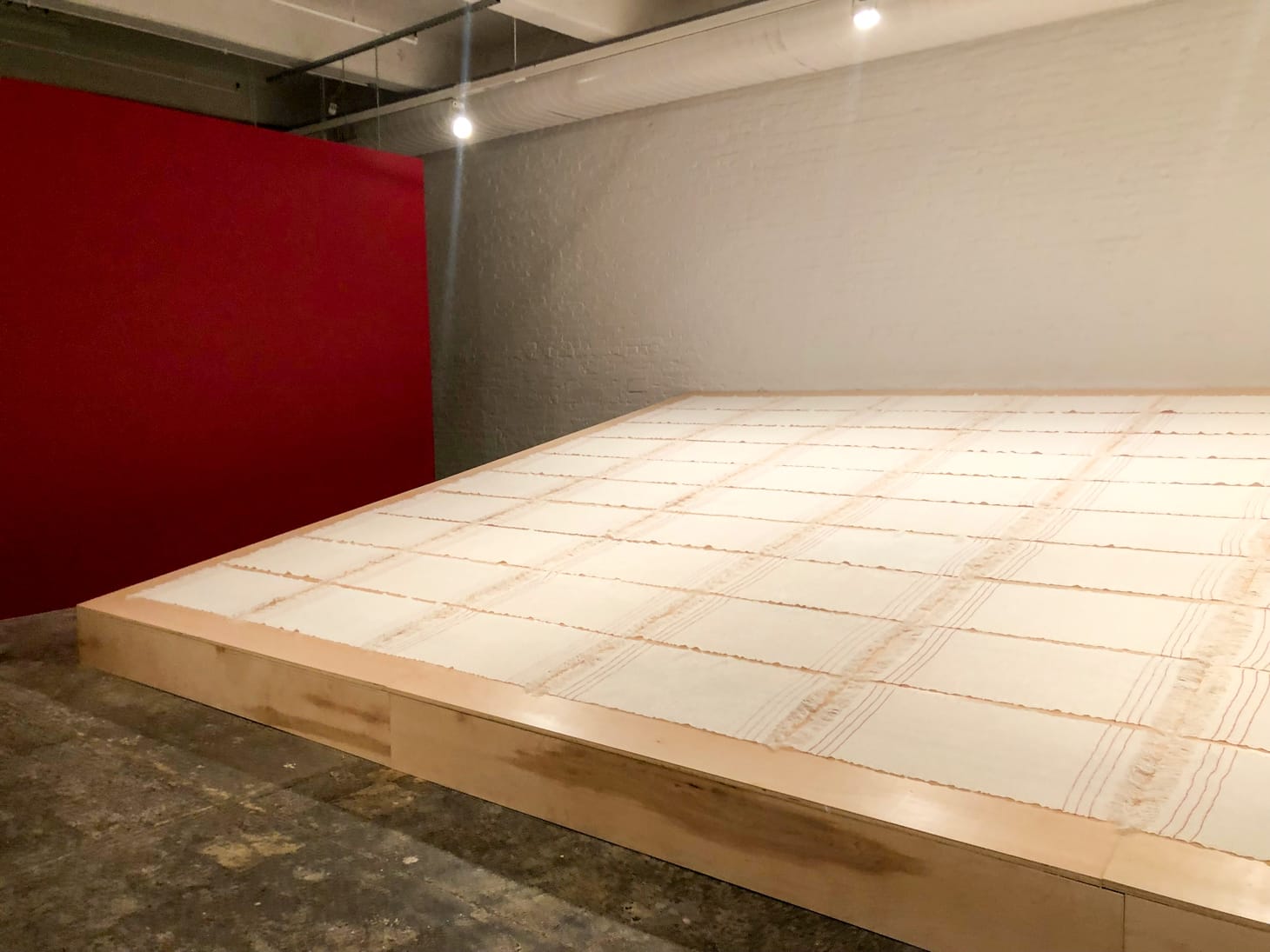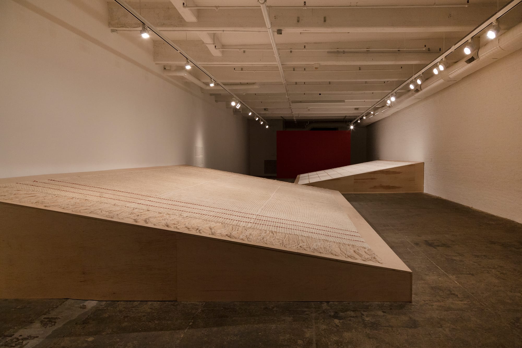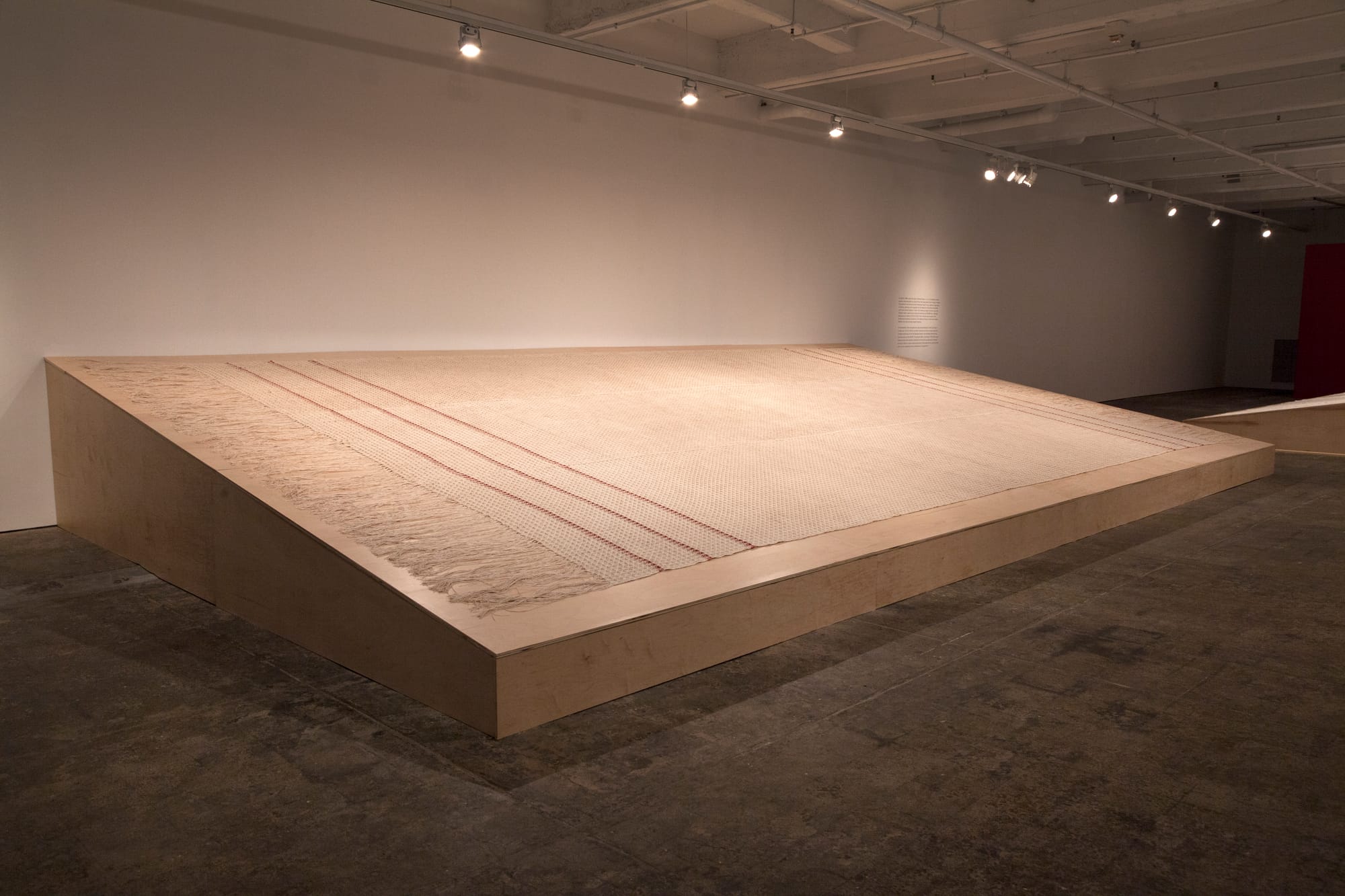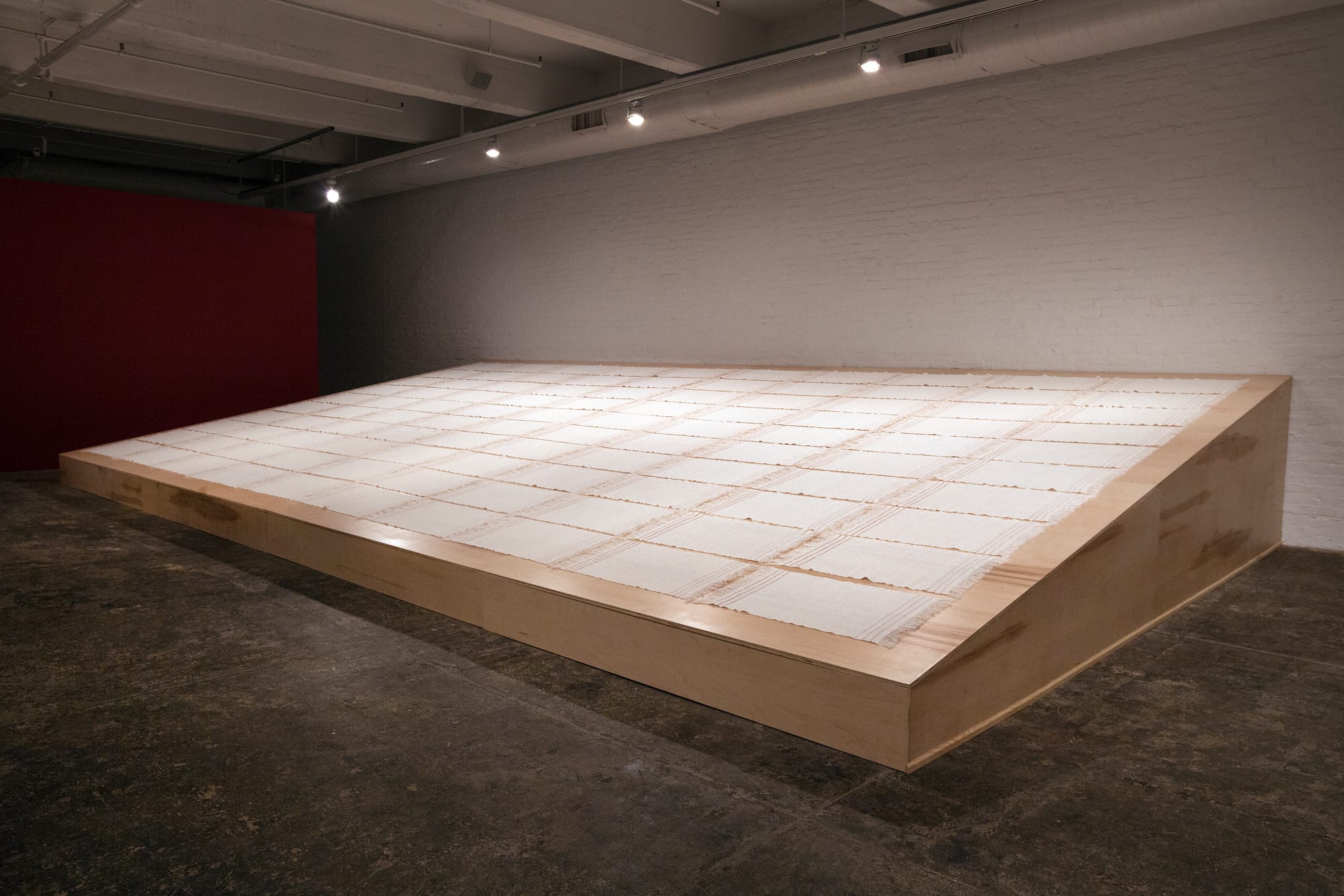 Clark’s version of the truce flag stretches 30 feet by 15 feet (the largest woven cloth that Fabric Workshop has produced since it’s opening in 1977), and is displayed on a massive, sloped platform similar to the one displaying the Star Spangled Banner at the Smithsonian. Across the gallery are 100 flags laid out on an identical platform, signaling a mass creation of the little-known cultural symbol. Clark is forging more of these flags into existence, as it falls far behind the well-known rebel flag in terms of material presence.