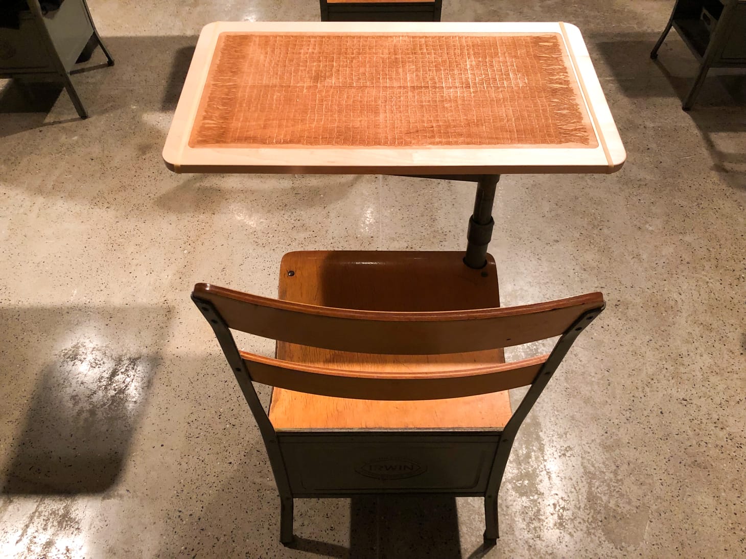 While the upper gallery is contemplative, the lower gallery is active. There, visitors can make rubbings of the flag, retrofitted into the wood of school desks — a nostalgic experience of “becoming intimate with a symbol through touch,” Clark says. “We remember through touch and experience.”