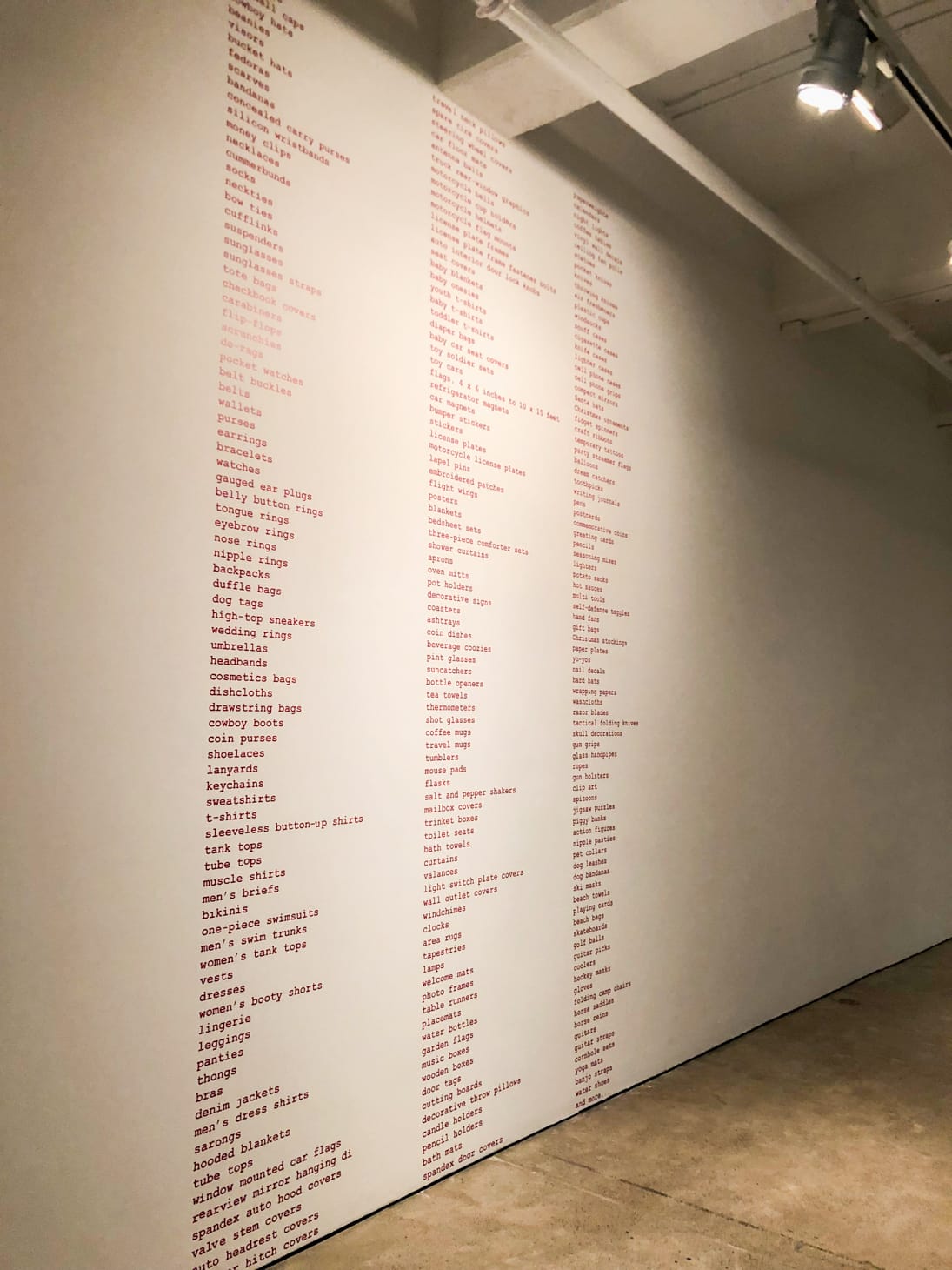 There is only one Confederate flag in the gallery — an active choice on Clark’s part to not further disseminate its likeness. In place of material manifestations of the flag, Clark lists the hundreds of objects you can purchase for sale adorning the flag — dishcloths included.