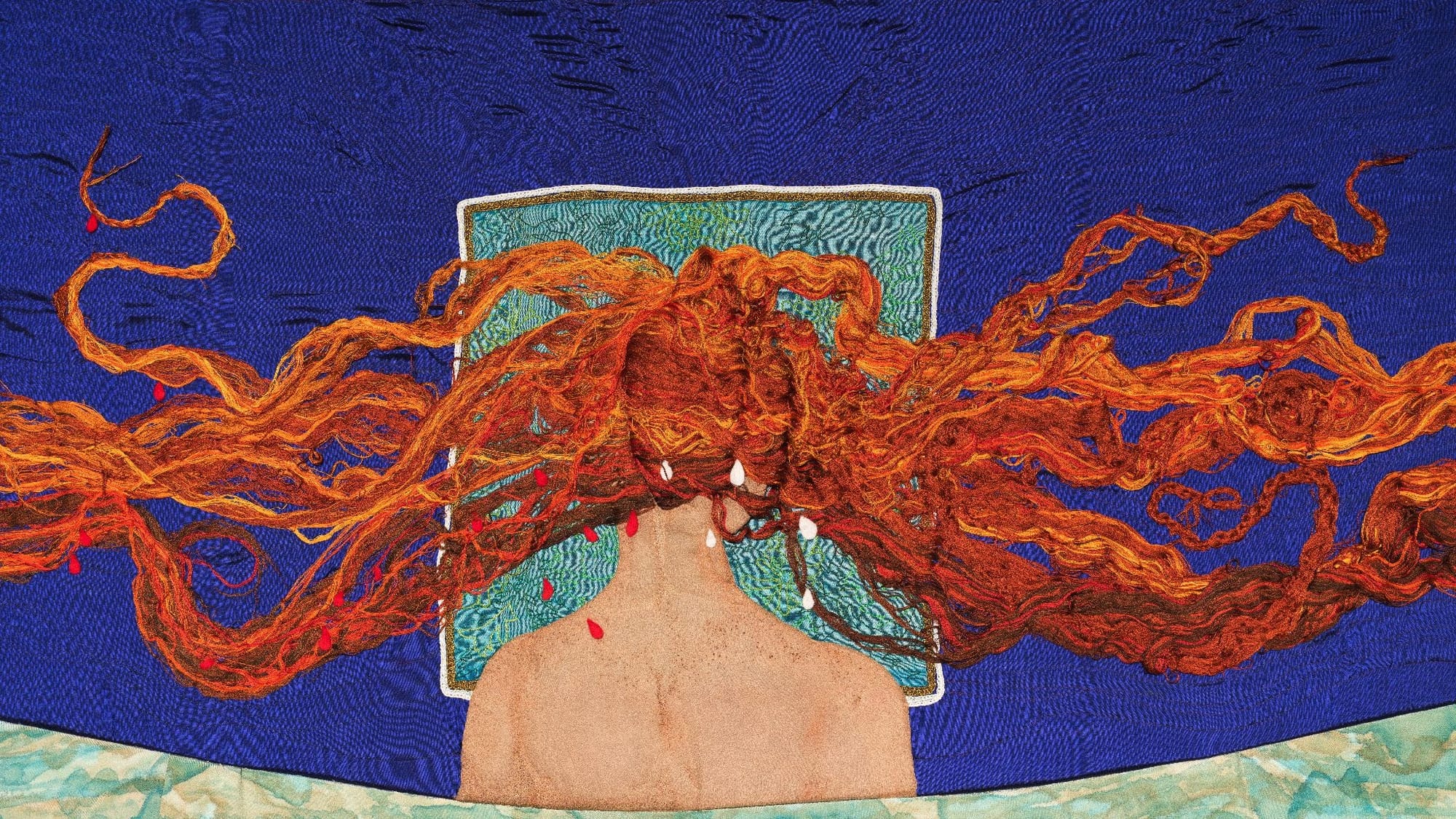 “The Map” is the second exhibition in The Magdalene Series, commissioned by Rua Red’s director Maolíosa Boyle to respond to the figure of Mary Magdalene. Constructed over two years and three lockdowns, “The Map” was itself a labor of Irish feminist-solidarity in practice, following on Fallon and Maher’s collaboration during the abortion referendum of 2018. For this project, the artists exchanged daily drawings and met weekly on Zoom with fellow artists, as well as Boyle. Hand-sewn, embroidered, drawn, painted, felted, appliquéd, and crocheted, pieces of “The Map” traveled between Fallon and Maher via post, resulting in something like an exquisite corpse. And, in fact, the completed piece represents a body: that of Mary Magdalene, whose storied red hair blazes at the top of the piece in tangled plaits of shimmering auburn and gold floss.