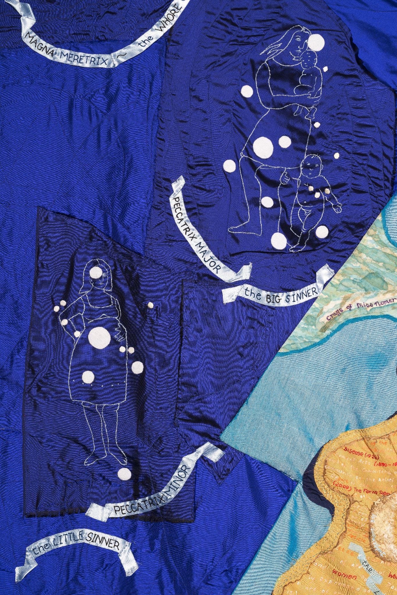 Reading this map, one navigates mythical territories (“Outer Sanctimonia,” “Slag Island,” “Heterotropia”), sea monsters (“Prejudice,” “Poverty,” “Ignorance,”), and fantastic topographies (“The Mounds of Mam,” “Hierarchy Heights,” “Super Ego Falls”). Sister star systems “Pecatrix Minor” (the body of a pregnant woman) and “Pectrix Major” (a single mother with two small children) indicate punishments for unmarried Irish mothers, while “The Little Laundress” and “Ten Cigs” constellations indict Ireland’s notorious treatment of women inside church-run asylums known as Magdalene Laundries, which operated between the mid-18th and late-20th centuries; according to the artists’ research, the only possession allowed these women was 10 cigarettes. The laundries were named after Mary Magdalene to invoke a biblical drama of sin (specifically, prostitution), penitence and devotion (in all four canonical gospels, Mary Magdalene crashes a dinner party for Jesus, weeping and anointing his feet and hair with expensive perfume), and, finally, forgiveness and redemption. In reality, the laundries, in which at least 10,000 “fallen” (poor, unmarried, pregnant, or otherwise deemed unruly) women were incarcerated in the first 70 years of the Irish Free State, were brutal, for-profit workhouses. The last Magdalene Laundry only closed in 1996.