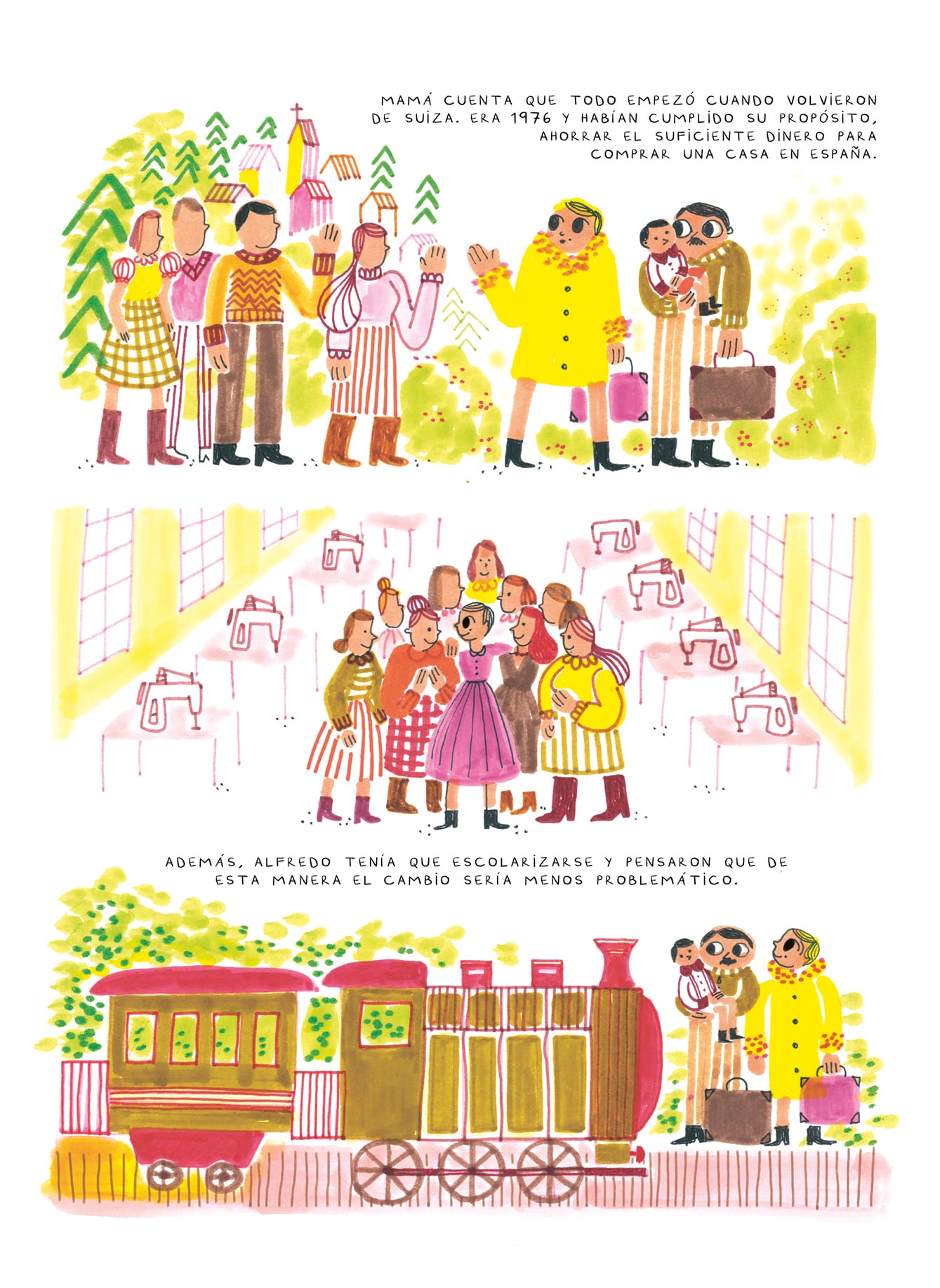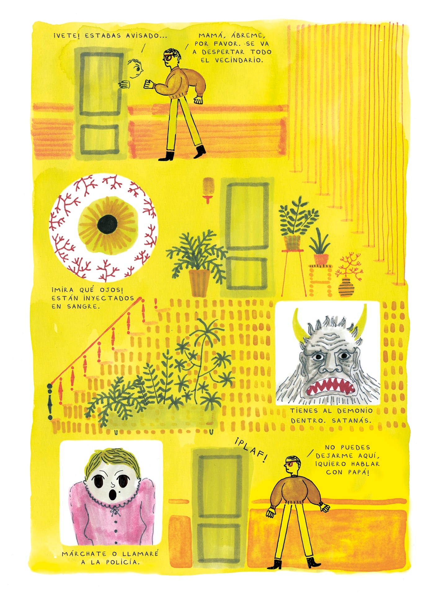 Though she’s only a child, Vera takes on the enormous emotional weight of her mother’s illness. After yet another blow-up, this time because Adela has started drinking to combat her condition, Lema depicts little Vera among her toys, cradling her doll-sized mother in her arms. The heartbreaking role reversal is captured only by this image and simple text on the spread: “Yo te cuido, Mamá” (“I’ll take care of you, Mommy”). Years go by, and Vera is still the principal caretaker for her mother while her older brother and father remain painfully out of touch. Lema dedicates the latter part of her book to the struggles of caretaking, both imbalances between demands on men and women and the difficulty of looking after oneself while caring for another.