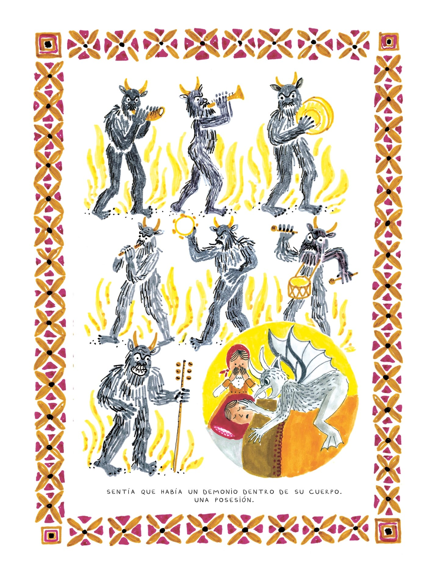 Bea Lema does not shy away from the vulnerability of autobiography. The Galician artist and writer’s moving new book El Cuerpo de Cristo (The Body of Christ) parallels her own life growing up with a mother who suffered from severe mental illness. Illustrated in marker and thread, the book follows the young Vera, who desperately wants to protect her mom Adela from the demons who torment and even threaten to end her life. Though centered on a single family’s pain, El Cuerpo de Cristo is also the story of women’s experiences across three generations in Galicia, Spain, offering a more universal meditation on trauma, caretaking, and shame.