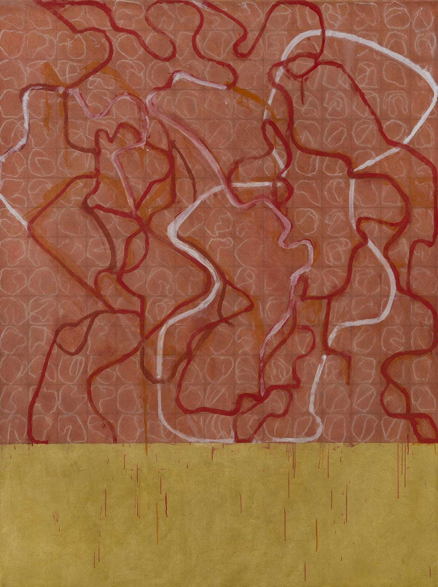 Using the same proportions that he chose for his terre verte paintings, Marden demarcated a 6 by 6-foot square, leaving a two-foot band below. He then divided the square into a grid of 225 squares, using a pencil, so that it rests on the band. The palette in the upper part of the painting consists of sandstone red, Chinese red, and ghostly white, while the band below is a mustard yellow infused with green — obliquely complimentary colors. The band also stirs up associations with Chinese scroll painting, in which the work is mounted on yellow silk.