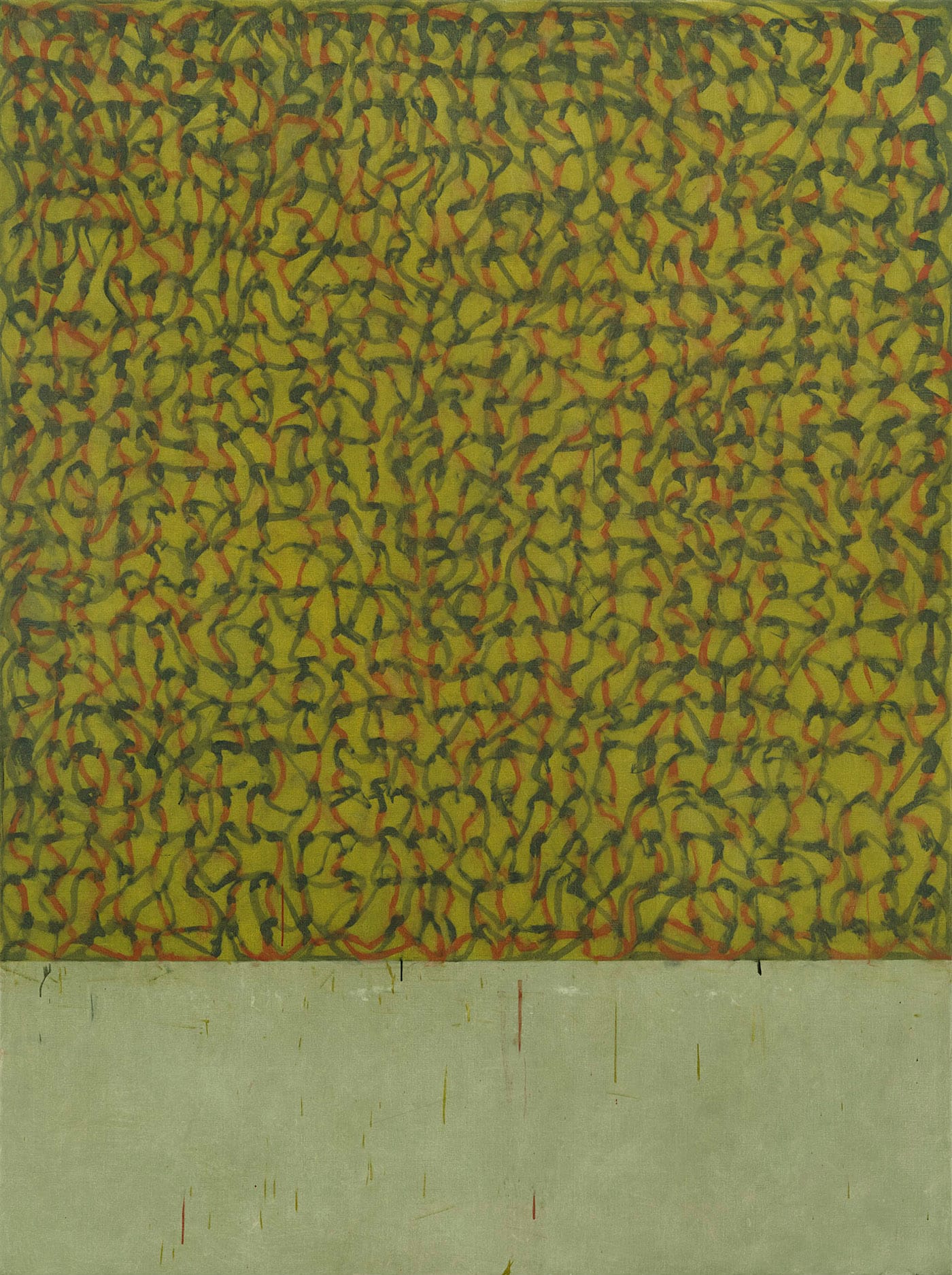 Marden applied a thin wash of one of the terre vertes over the entire surface. He then measured off a horizontal line, which resulted in a square on top, tightly filling the upper portion of the vertical format, while leaving a wide band running along the bottom. This compositional structure seems to have been inspired by the proportions of a vertical sketchbook that he was using at the time. Next, he filled the square with successive layers of wet, slow-drying paint, allowing thin rivulets of color to drip down from the square’s bottom edge into the band below, like ragged strings. By dividing the canvas into two unequal areas and covering the surface in strict monochrome, Marden limited his control over the painting’s imagery, as well as surrendered his ability to determine what happened in the wide band below.