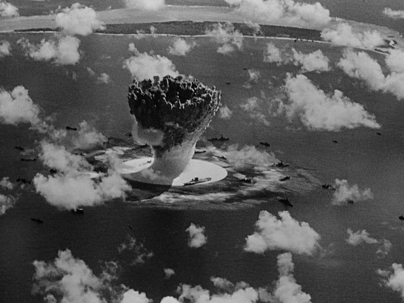 Perhaps the loudest, largest, and most unambiguously immersive work on display is Bruce Conner’s “CROSSROADS” (1976). The film’s pulsating synth score, composed by Terry Riley and Patrick Gleason, has an almost gravitational pull to it. Our perception of the film’s imagery — slow-motion replays of US atomic bomb testing off the Bikini atoll — is decisively affected by the swirl of its magnetic sounds. Simply put, what otherwise would seem horrifying is instead spellbinding. Conner’s brand of hippieish Dada distorts world-historical destruction into an entrancing phantasmagoria, a sleight of hand that can’t help but seem all the more ominous today. Straightaway, Conner’s film demonstrates one of the more ambivalent qualities of immersive moving image art: a stupefaction that inhibits or melts away thought. As Gorky recounts of his Dreamland experience, “The visitor is stunned; his consciousness is withered by the intense gleam; his thoughts are routed from his mind; he becomes a particle in the crowd.”