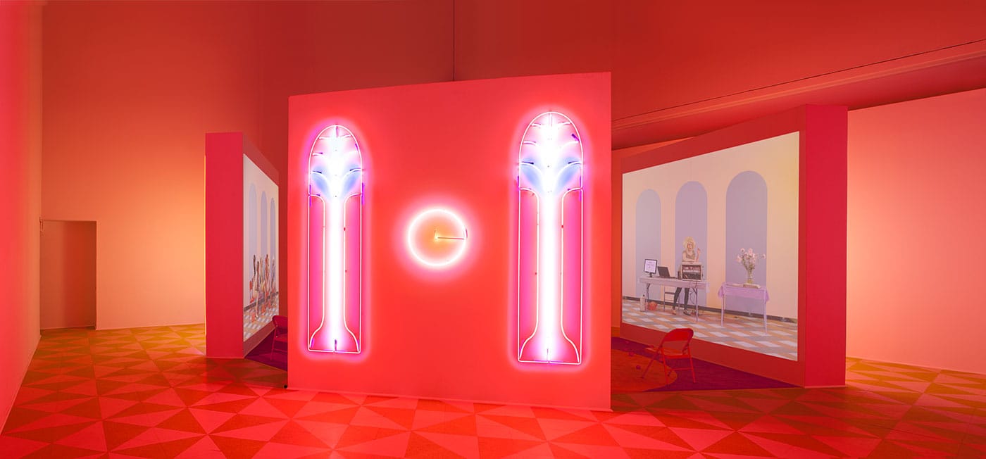 As it happens, many of the newer works on display in Dreamlands seem cannily aware of the inevitable threat of distraction, even guarding against it at the architectural level by snugly ensconcing audiences in their folds. “Easternsports” (2014) — a collaboration between Alex Da Corte (sets, costume, video), Jayson Musson (script), and Devonté Hynes (score) — is a four-channel, 152-minute video projected onto four walls that make up a porous, disjointed pavilion. The work’s absurdist, metronomic choreography — Tim and Eric meets Oskar Schlemmer, slowed by half — marries well with Hynes’s droning musical piece, which envelopes “Easternsports” in a sort of sonic cocoon. A more literal cocoon is presented by Ben Coonley’s “Trading Futures” (2016), perhaps the most technically adventurous work in Dreamlands. It’s a 360-degree 3D video — a sardonic “lesson” in market strategy and the dialectics of seeing — projected onto the interior of a cardboard geodesic dome.