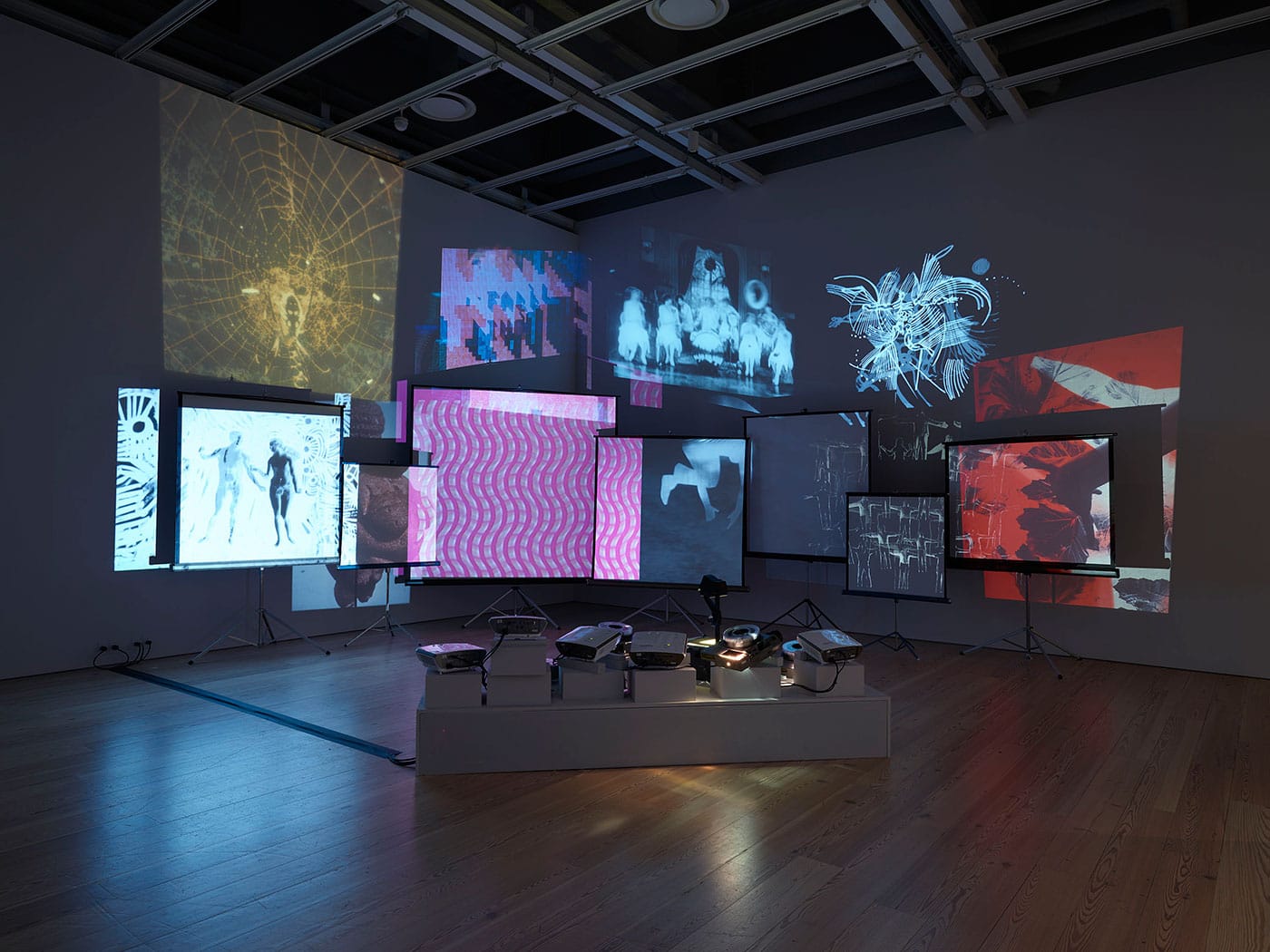 As may be evident from the small selection of works discussed here, Dreamlands is, thematically, a little all over the place; its net is cast dizzyingly wide. Seemingly every wall text introduces yet another tangle of themes: utopia and dystopia, cyborgs and science fiction, artifice and nature, image culture and patriarchal control, space and surveillance, the materiality of cinema, the extinction of this materiality, the history of seeing, the future of work. But even if it’s at times unwieldy, it’s refreshing to see a large exhibition risk such clumsiness, striving to grasp the whole of what it’s after, rather than reducing its aspects to neatly narrativized, palatable little chunks. (The conjunction of moving image art and immersion and technology is, after all, pretty expansive terrain.) This approach, moreover, only further encourages museumgoers to cleave their own paths through the exhibition and form their own stories — no two the same — yielding an interactivity more potent, if significantly less obvious, than that achieved by the desperate, gimmicky social media campaigns (Instagram this! Snapchat that! Don’t forget to use our hashtag!) regularly foisted on visitors these days. Scorning any pandering route, Dreamlands instead asks us to revel in its disorder and embrace the shape-shifting nature of moving image art’s motley forms.
