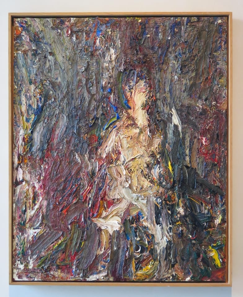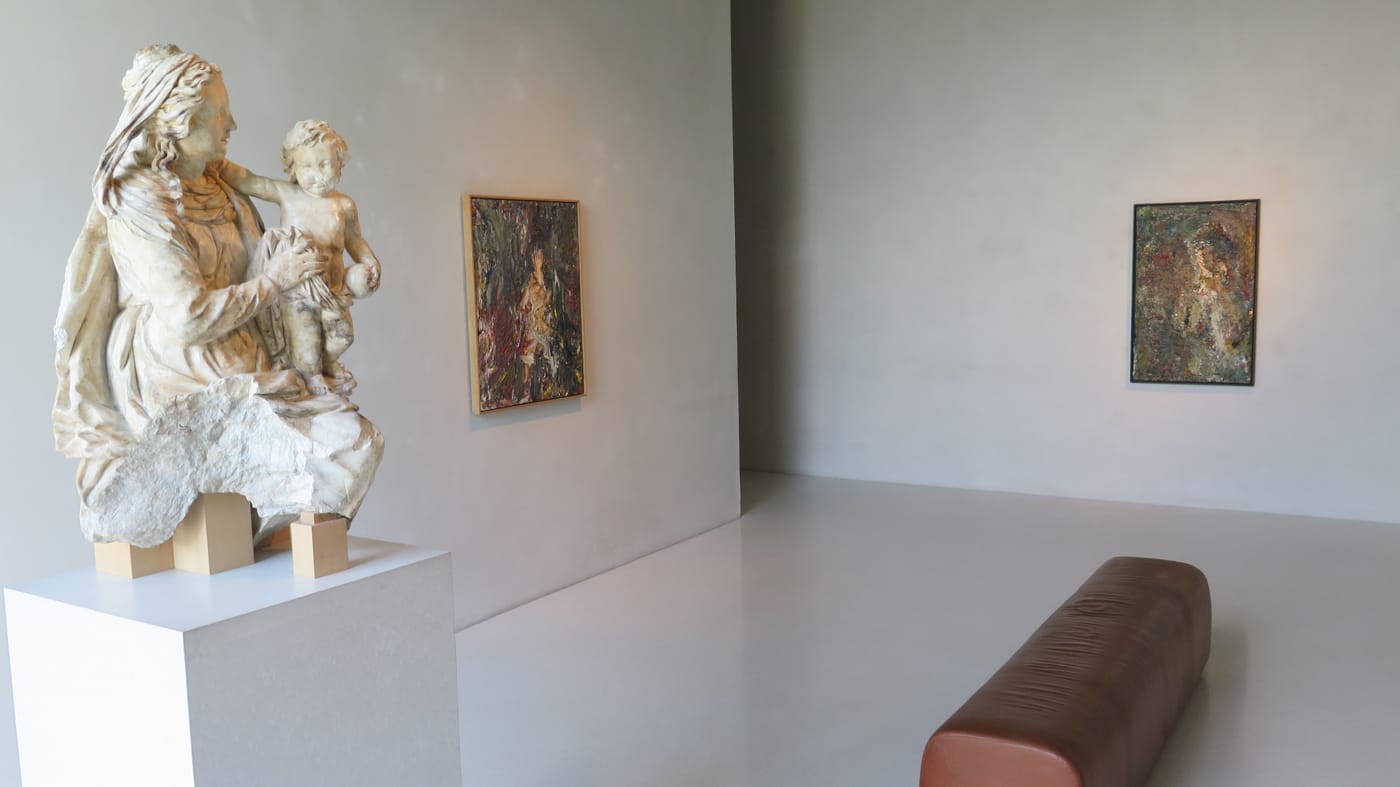 In another gallery, fleshy paintings by Eugene Leroy, sensual abstractions of the figure like “Petit nu profond (Small profound nude)” (1997), are again linked to the distant past with a neighboring bust of “Madonna and Child from the Altarpiece of St. Mary in St. Kolumba” (1677), which was rescued from the ruins of the church and restored from 70 fragments after having been destroyed by American and British bombs in 1945. Leroy’s grotesque and textural nudes are also exploded — into tiny fragments of oil paint.
