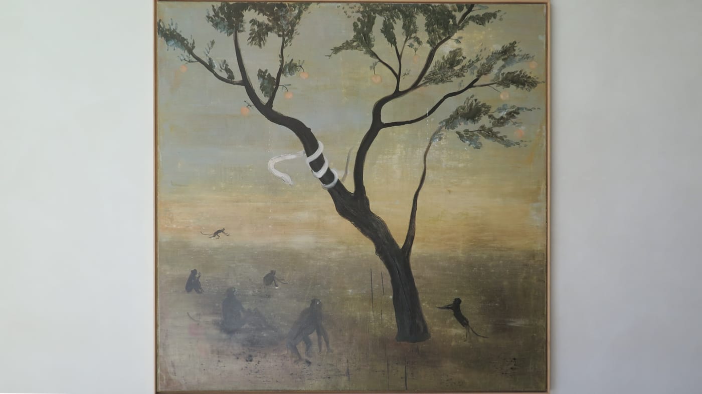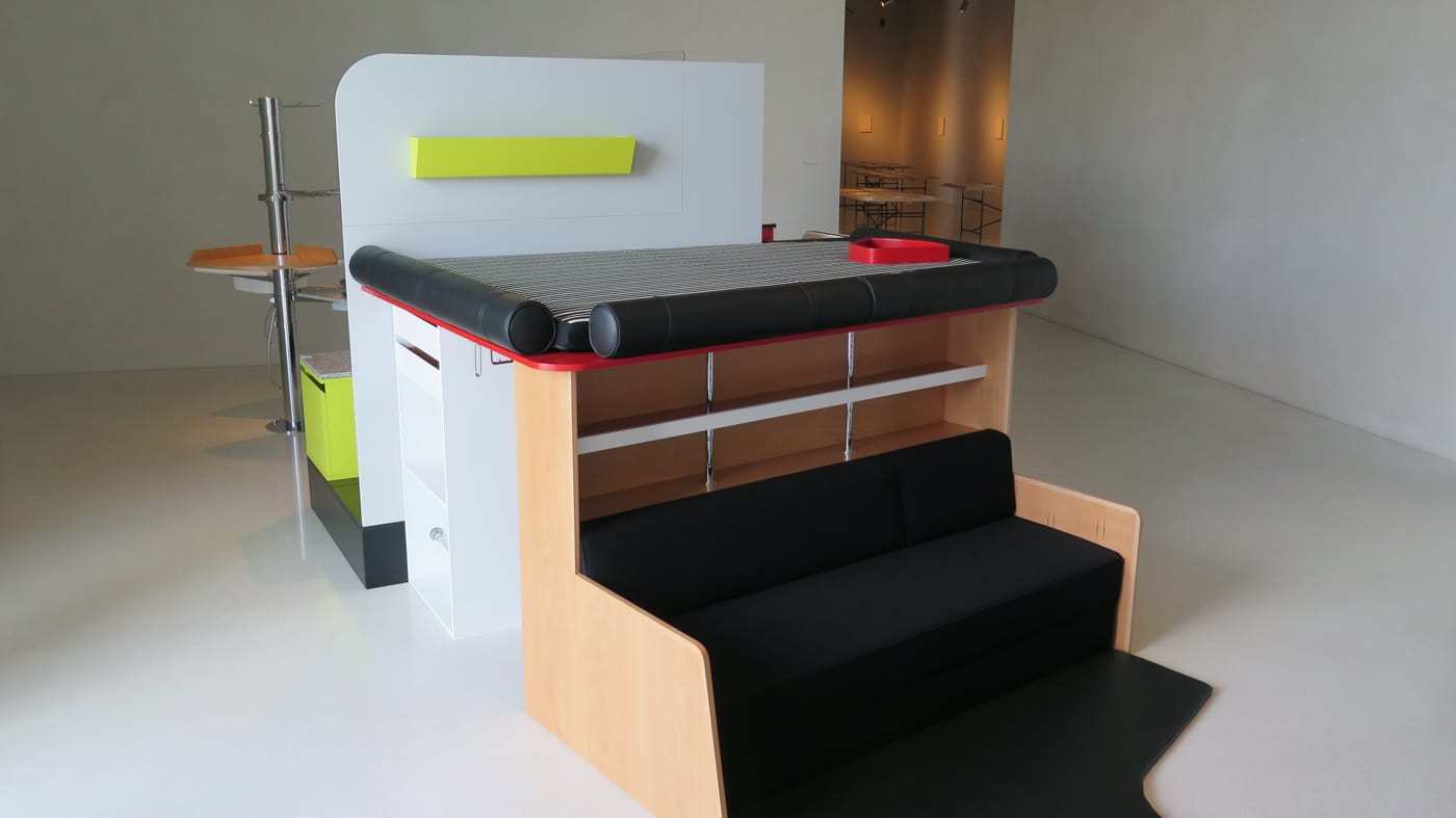 Between the south tower and Newman’s installation, a collection of 25 Archivolt figures from the St. Peter Portal at the Cologne Cathedral dating back to the 14th century are scattered around a low gallery and spotlit with warm bulbs. These sacred figures are flanked with contemporary works by Norbert Schwontkowski and Stefan Wewerka. Schwontkowski’s painting, “The Eve Before History Began” (2006), is bathed in natural light from a window looking out over the Cologne Cathedral, and it depicts the Garden of Eden without Adam or Eve, but instead monkeys, suggesting an alternative history of humankind that is at odds with the context of the museum. Wewerka’s sculpture, “CELLA with Kitchen Tree and Swing Chair” (1984), is a futuristic modular living space where every nook, shelf, or seat faces out into the gallery — the opposite of the sheltered and private domestic spaces we are used to.