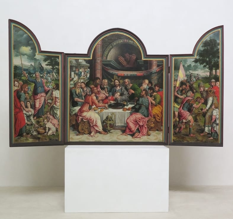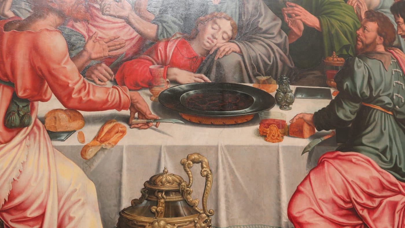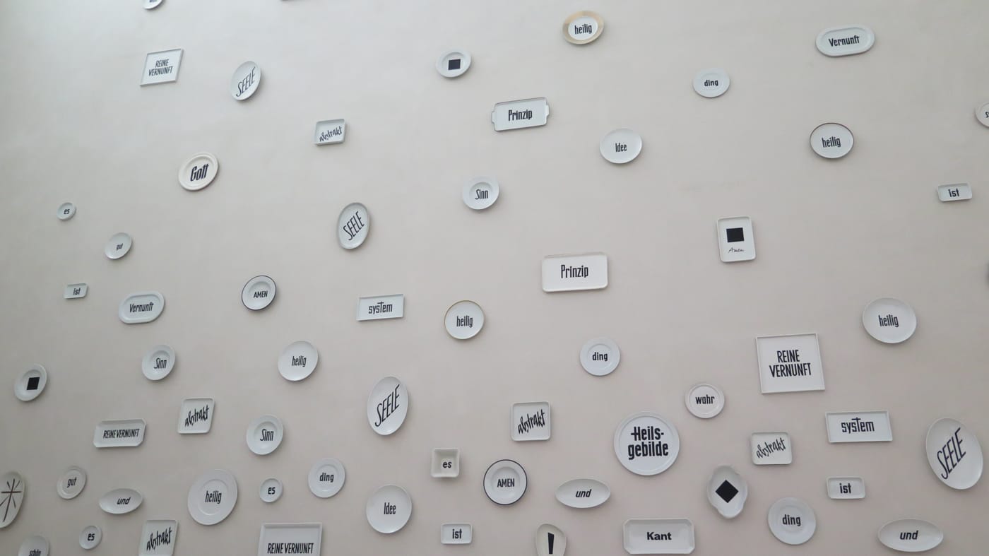 The retable is on display after a restoration process that took more than two years. Here the busy Renaissance composition, which contains a whole world, has space to breathe. But the restoration also reveals several psychedelic imperfections: A piece of bread on the table surrounded by Jesus and the apostles seems to bend with the tablecloth, and a water jug has been rendered transparent, as if hanging between this dimension and the next. On the opposite wall, stretching toward the ceiling and large windows above, Blume’s porcelain plates propose thoughts about the retable with nouns, adjectives, and conjunctions in German, like “and,” “is,” “abstract,” “soul,” etc. The south tower is the emotional climax of the current show, and it is representative of the museum as a whole.