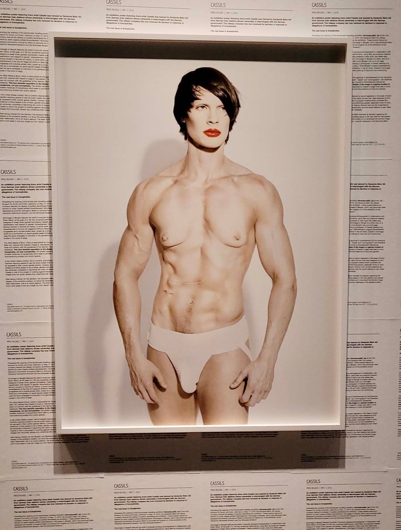 In other works, such as “Advertisement: Homage to Benglis” (2011) by Cassils, which serves as the show’s lead image, gender identity and queerness are more central to the artwork itself. Cassils, who identifies as gender-nonconforming trans masculine and often uses their body as the mechanism or site of artworks, conceived the image in reference to Lynda Benglis’s controversial advertisement in the November 1974 edition of Artforum. At AGO, the portrait is hung against a backdrop of wheatpasted statements Cassils made in 2016 when the image was banned from use in advertisements displayed in Berlin train stations.