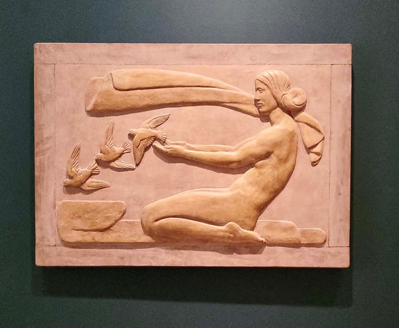 This sentiment pertains to works in the show like “Dawn” (c. 1948) by sculptor Frances Norma Loring. Born in Idaho in 1887, Loring was an extremely prominent sculptor in her day. After spending time in Europe and New York, she moved to Toronto in 1913, and represented Canada at the 1960 Venice Biennale. She also had a lifelong romantic partnership with another female sculptor, Florence Wyle. Nothing about “Dawn” is explicitly queer — it is a plaster relief of a nude female form releasing a trio of birds from her hands. Likewise Louis de Niverville's painting "The Doll" (1976), which portrays a porcelain-faced doll releasing a tiny unicorn from her outstretched hand, is more strange than queer in a sexual sense — but part of queering the collection, in Moreira’s view, is including artists who were forced to conceal aspects of their identity in order to be recognized as part of their community.